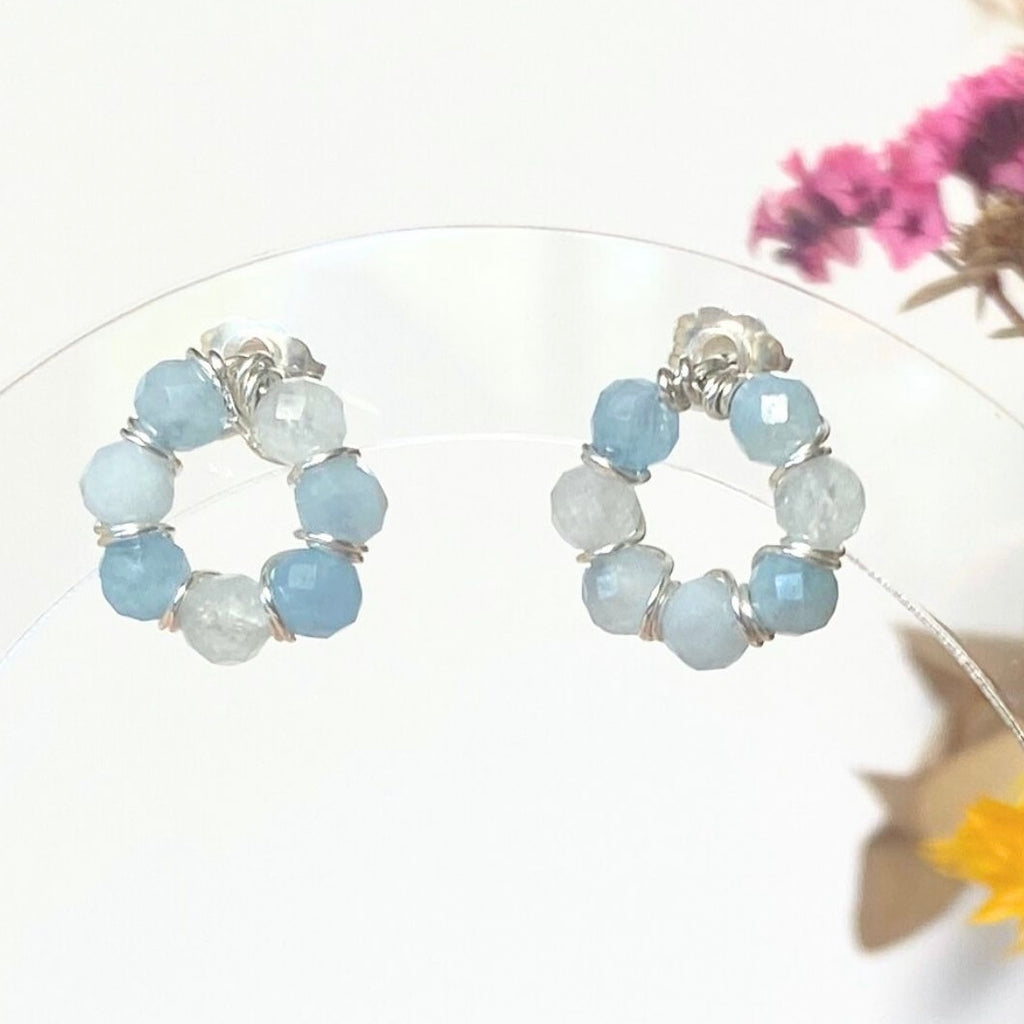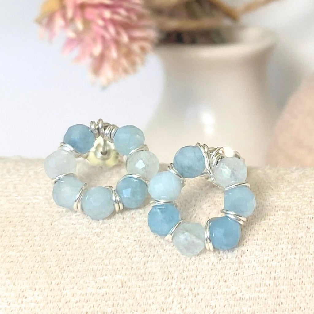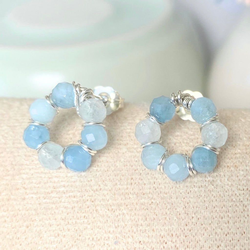 These gorgeous stud earrings feature a circle of natural aquamarine beads, complemented by bright sterling silver wire wrappings between each pair.
