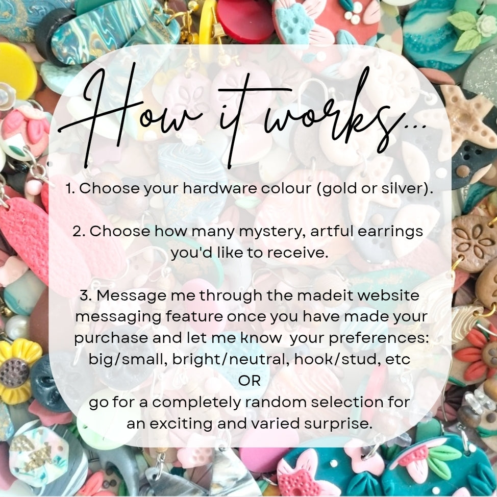 If you decide to place an order for an Artful Earrings Mystery Box - you can use the madeit messaging feature to let me know your personal tastes and perferances: studs or hooks, brights or neutrals, big or small OR go for a completely random selection of designs for an exciting and varied mystery box experience.