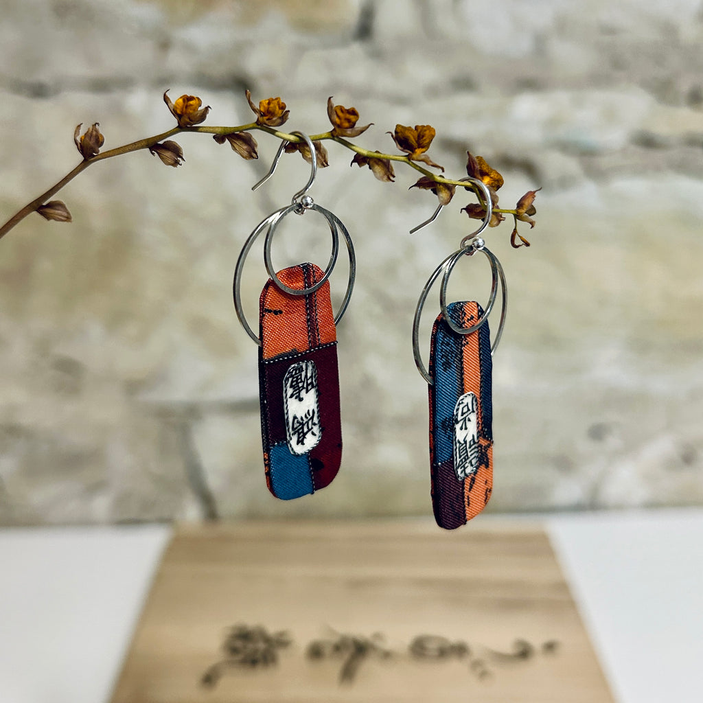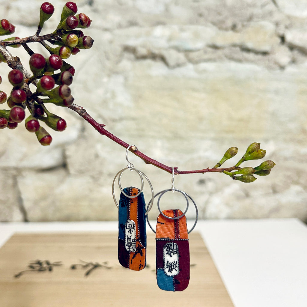 Lightweight textile earrings crafted from an upcycled vintage tie in autumn colours of burnt orange, plum, midnight blue and black - embellished with metallic thread, vintage Japanese ledger paper and stainless steel connectors - sterling silver ear wires. Both sides have been finished in the same textile.