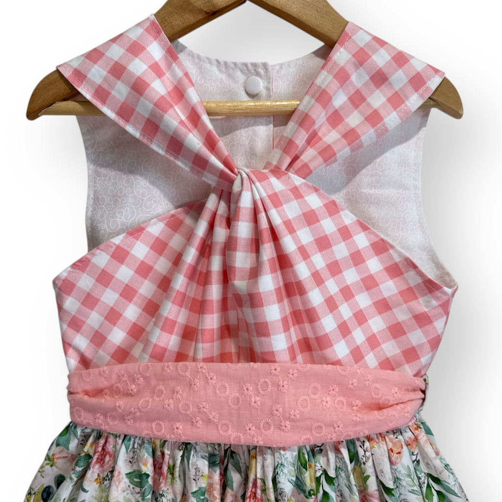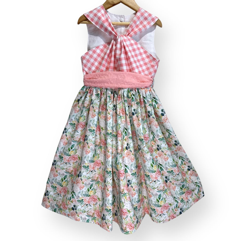 The Azalea Dress is a timeless, handcrafted piece designed to be treasured. Featuring a classic draped front bodice, this dress creates a soft and elegant silhouette while remaining comfortable for everyday wear or special occasions. The pink gingham bodice is gently gathered and crossed at the front, adding beautiful texture and vintage-inspired charm.
