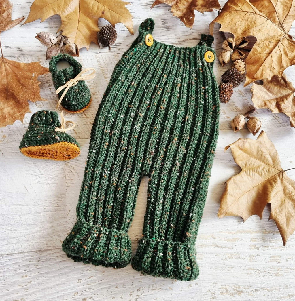 Beautiful little forest green tweed newborn baby dungarees.