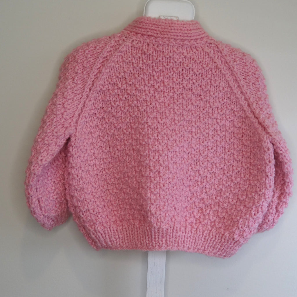 Your baby will be warm and cuddly in this hand knitted Pink jumper in 8 ply Acrylic Wool that would make the ideal gift for a new baby. Has 3 Buttons down the front. Machine washable with care. Hand knitted with love in a smoke free environment.