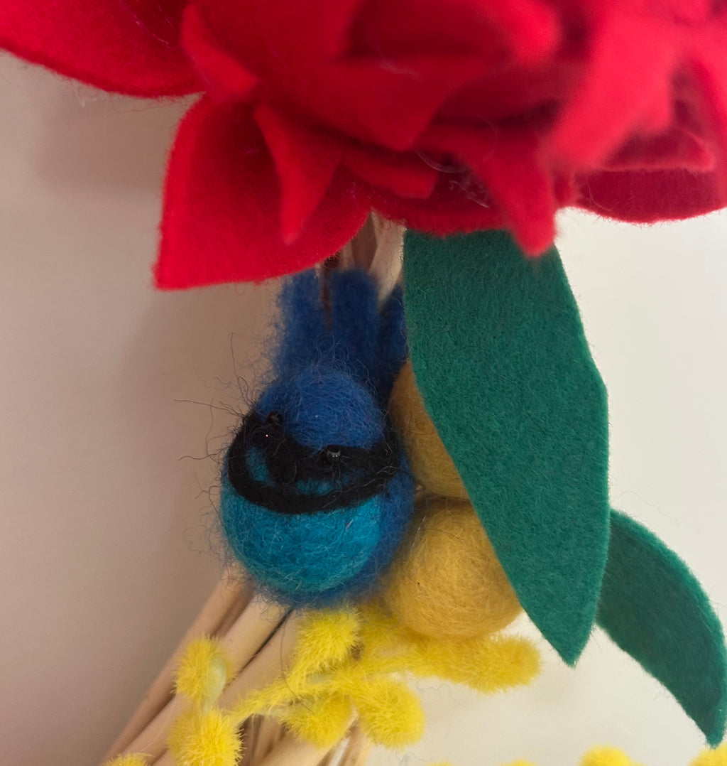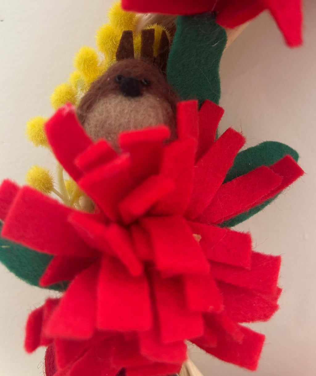 Imagine your front door or Christmas table greeting family and friends with a handmade Australian wreath. Recently at my local Christmas market customers said they have never seen anything like them. ‘It is so nice seeing our flowers- particularly beautiful waratahs in such a bright colorful wreath.’ I make each flower- cutting wool felt into pieces that go together to make these unique creations. I include my card and a handmade decoupaged gift tag so that if you are giving them as a present it is handmade and created by a real artisan. Some of my wreaths include little needlefelted blue fairywrens. These little guys are made from corriedale and merino fleece purchased from small Australian businesses. They are approx 35cm diameter and come with a hanging ribbon. Made with love and a little soul. I have them on huge sale ATM. Free Shipping!