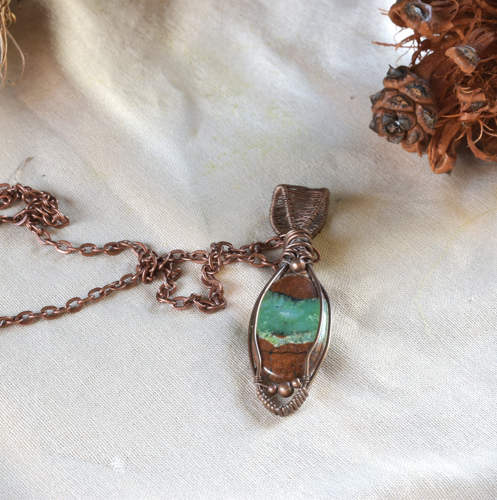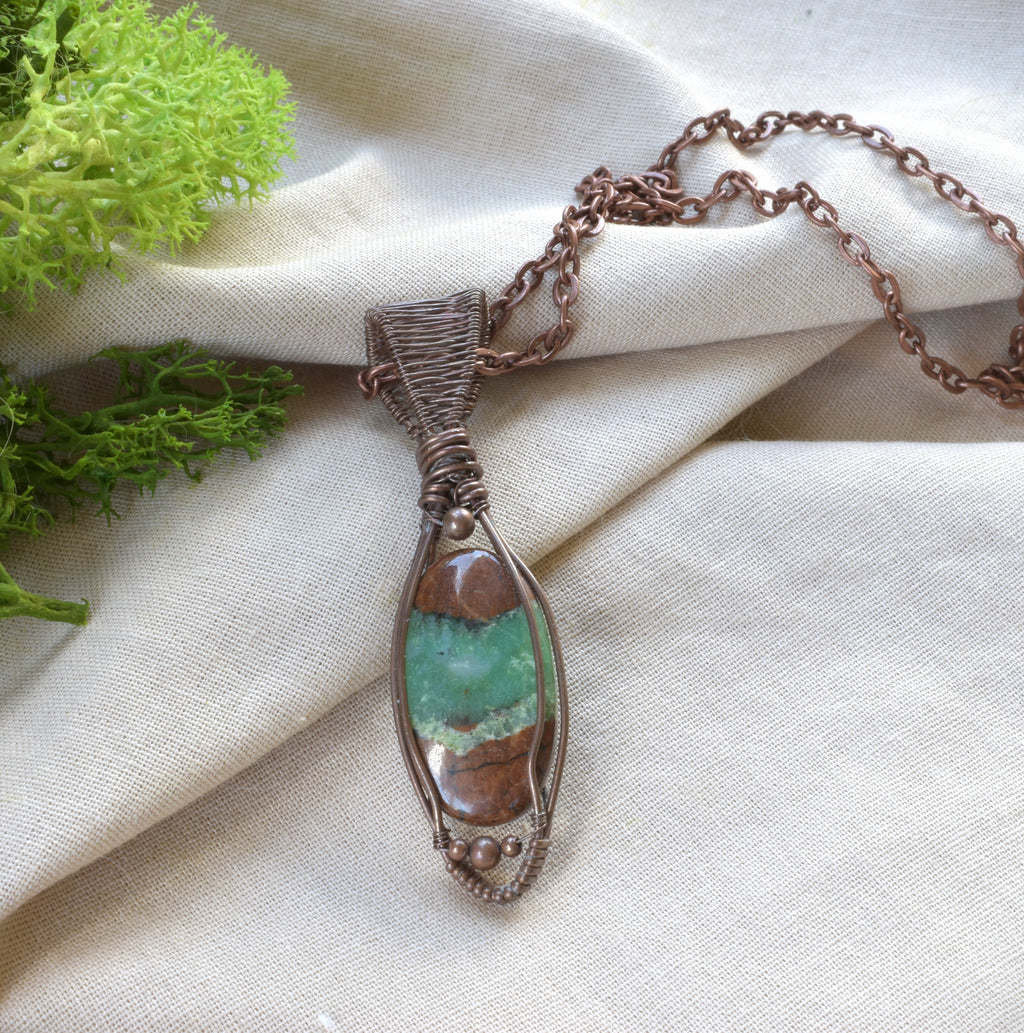 The stone is hand-wrapped in copper wire, shaped to follow its natural elongated form while maintaining an open, balanced design. The wrap supports the stone without overwhelming it, allowing the chrysoprase’s natural colour transitions and quiet depth to remain the focal point.