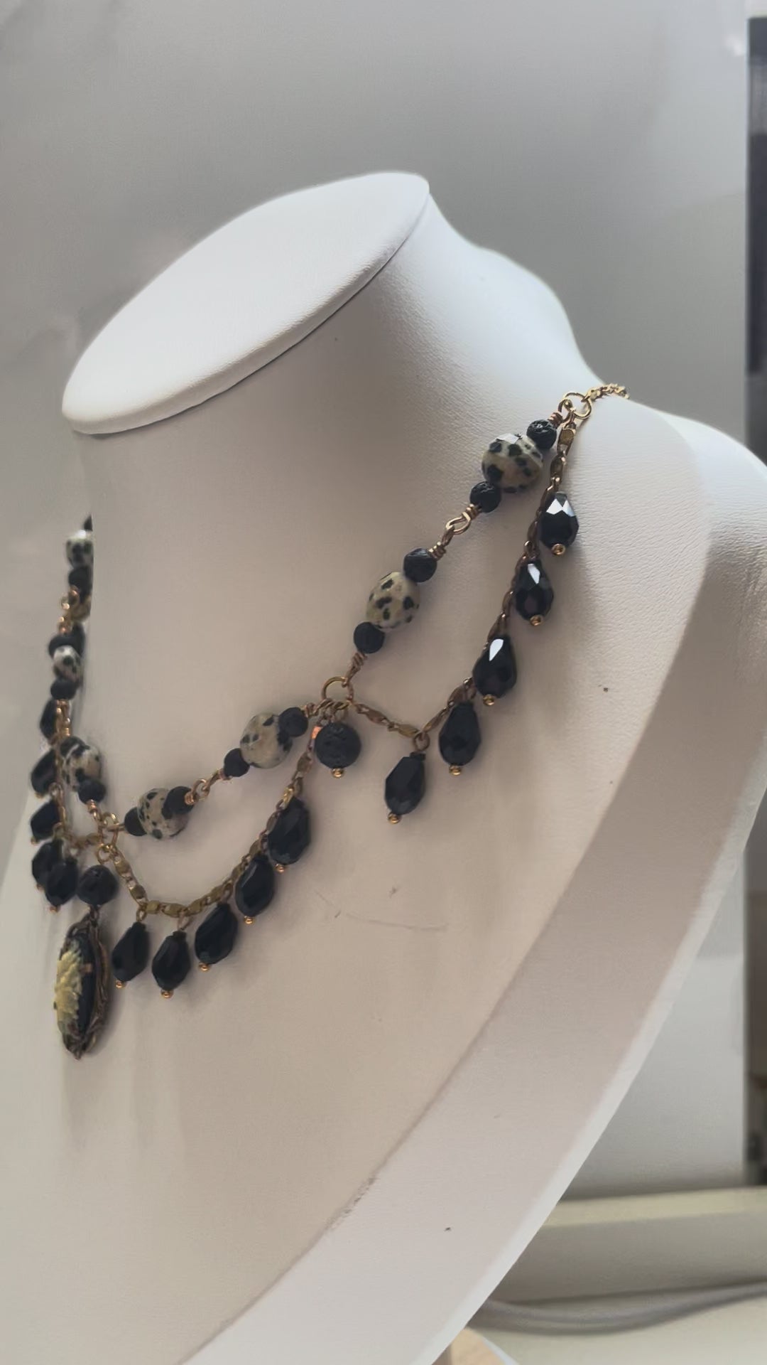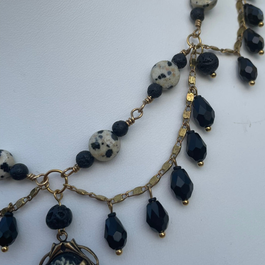 This necklace is a statement piece for sure. Lovingly designed and created in my home studio in Brisbane this necklace features leopard jasper and lava stone beads wrapped with brass wire with antique style brass chain and cameo pendant. The necklace is approximately 40cm long with a 5cm gold plated stainless steel clasp and extension chain.
