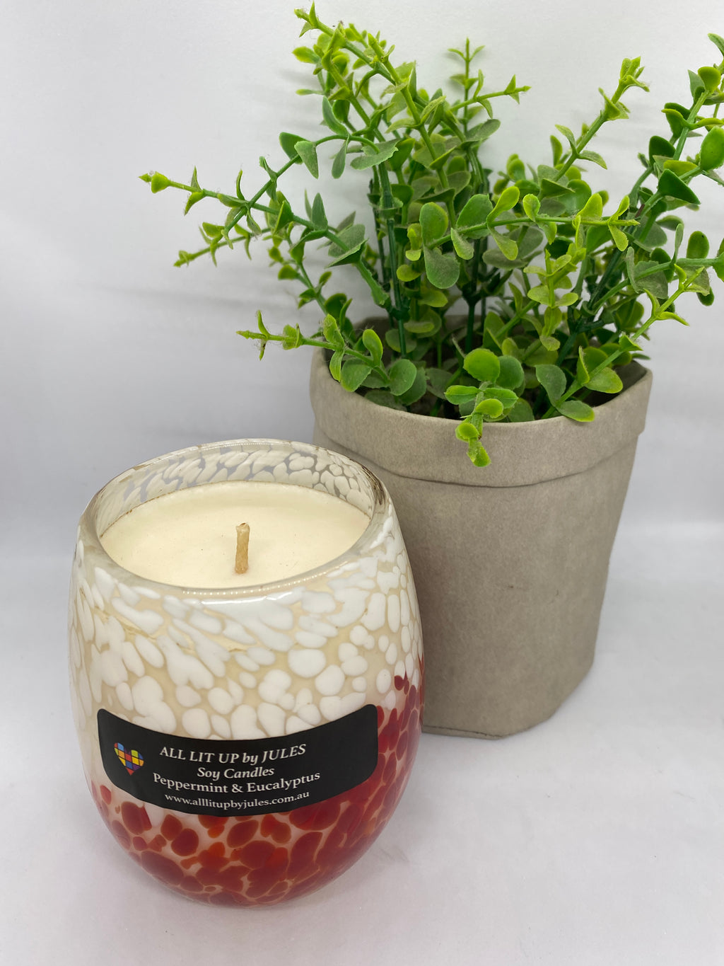 This unique red & white glass which reminds of of the Red Hot Poker flower, holds 450mls of Pure Soy Wax and the very fresh Peppermint & Eucalyptus fragrance. It has a 60+ hour burn time. All my candles are hand poured.