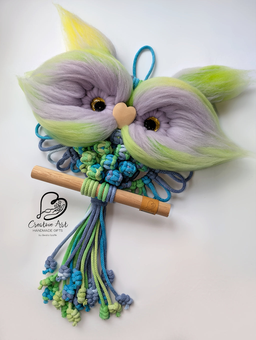 This macramé owl in bold blue and green tones is ready to fly in and brighten up the space. Handcrafted with love and attention to detail from brained cord (60% cotton, 40% viscose and polyester)and merino wool rowing, this owl is playful, eye-catching, and full of character — perfect for little explorers, animal lovers, and curious minds.