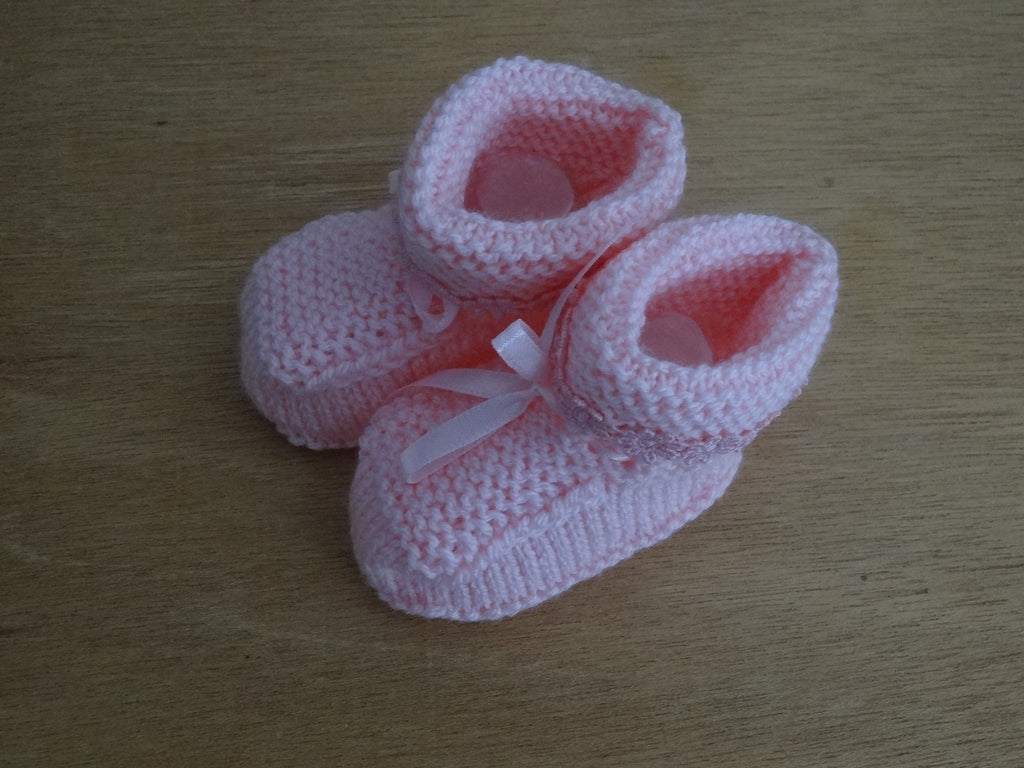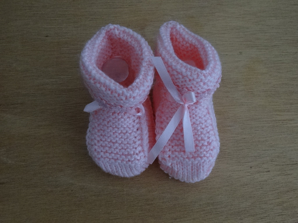 These lovely Pink hand knitted baby bootees with Pink ribbon trim are made with love and care and are made from a soft 4 ply Acrylic yarn with a ribbon accent and knitted in a smoke free area.