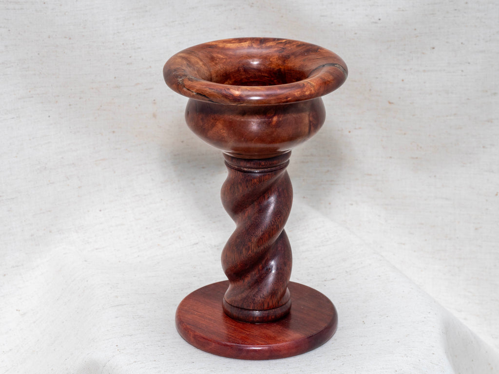 Hand turned Grevillea bowl polished with grain enhancing shellac, oil and wax finish, supported by hand cut Jarrah spiral finished in polished polyurethane. 10cm diameter, 15cm tall.