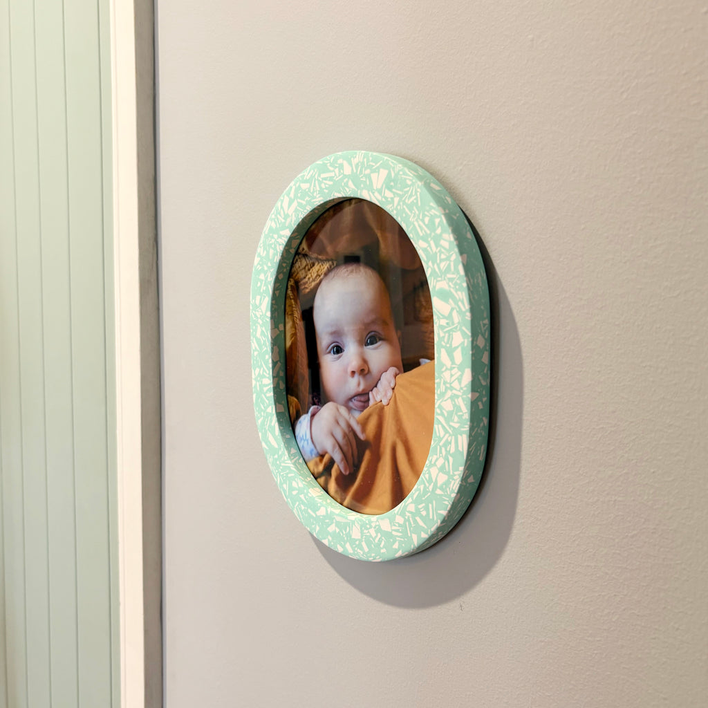 This handmade wall hanging turquoise with white terrazzo pattern photo frame is so bright and colourful. It will definitely add some fun to your home while displaying your beautiful memories. As each frame is made to order, the terrazzo pattern changes with each piece.