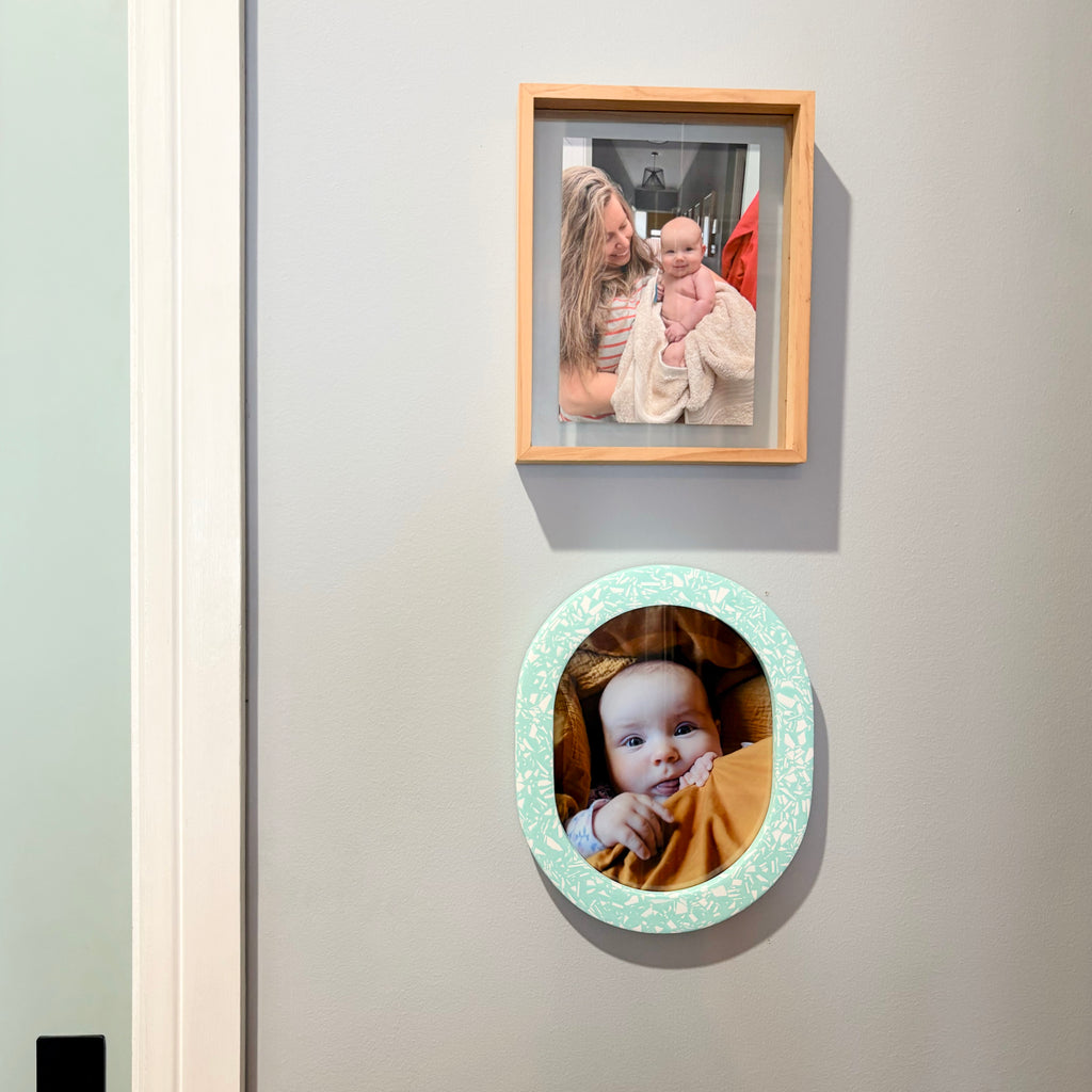 The eco resin frame has a clear acrylic front, with a pine backing. Each has a wall hanging hook installed (only in portrait position but message and I can create with hook to hang landscape). The photo is easy to change as required.