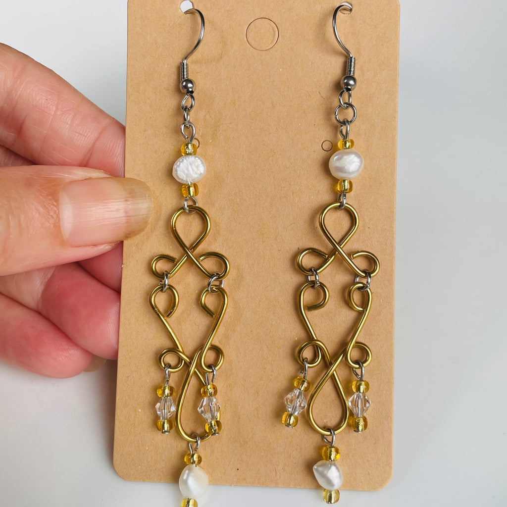 Be Seen wearing these Handmade Dangling Elegant Gold Wired Earrings created with White Freshwater Pearls and Clear Crystals with a touch of gold coloured Seed Beads.