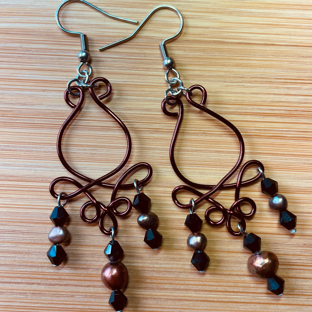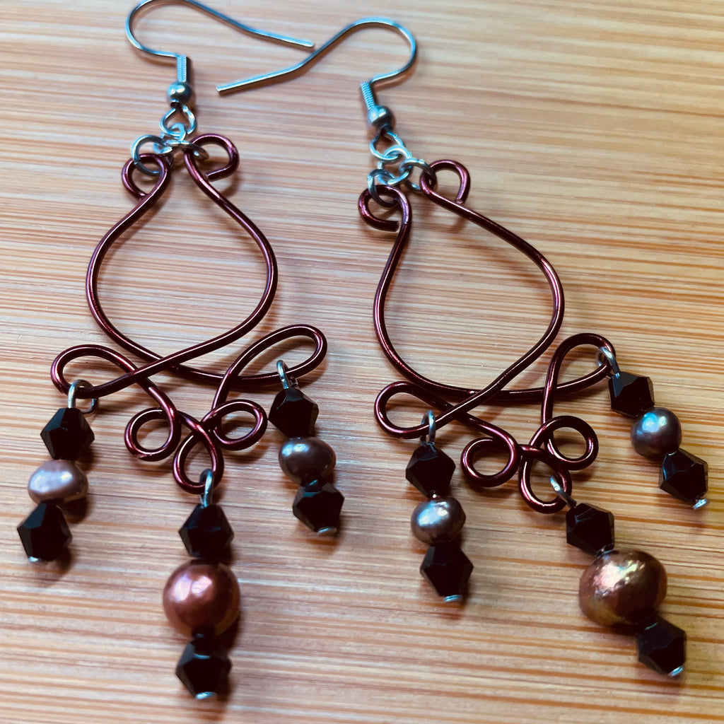 To complete these Earrings Coffee coloured Freshwater Pearls and Black Glass Crystals are added as droplets off the B’s Rose Bud wire pieces.