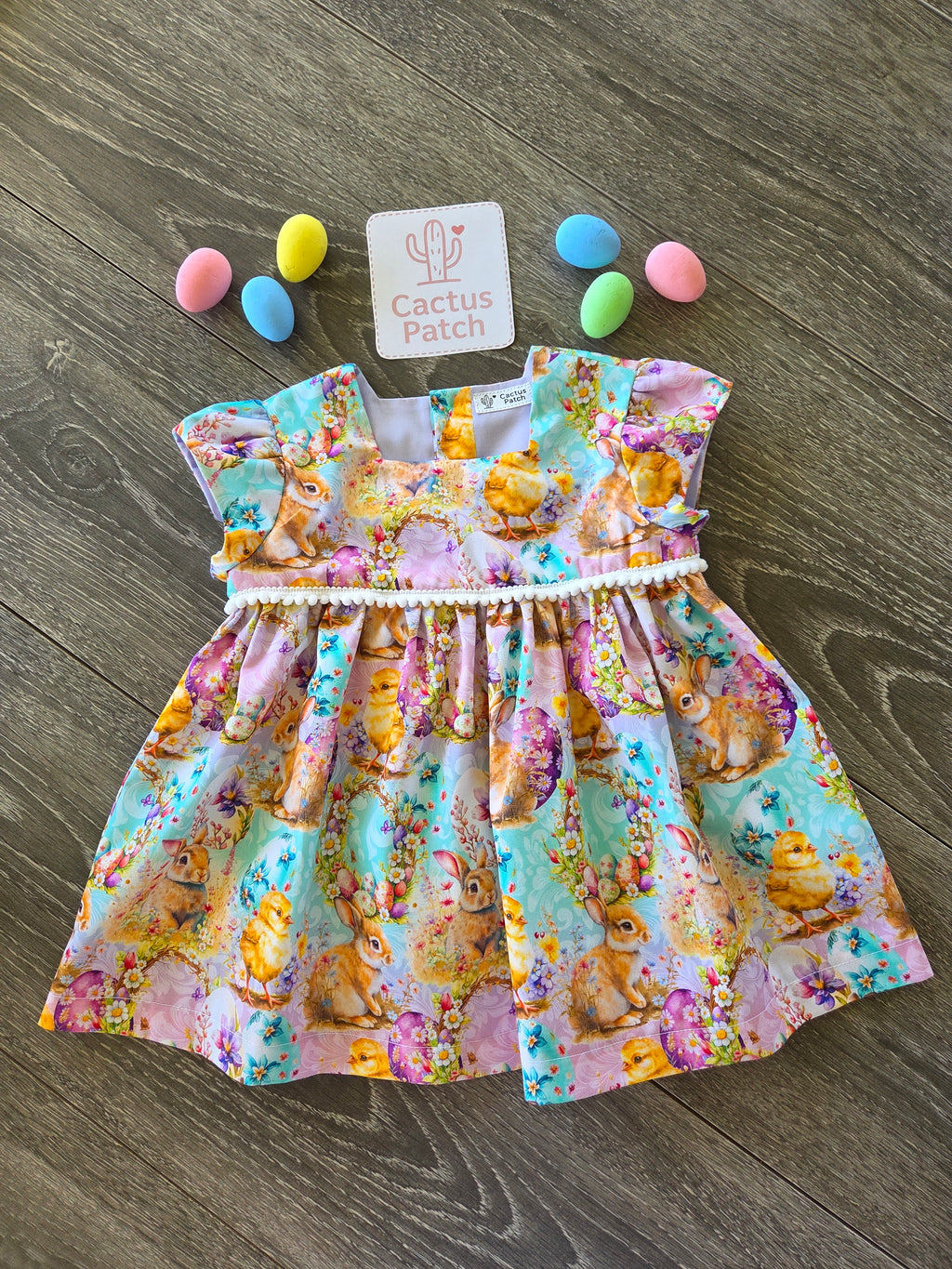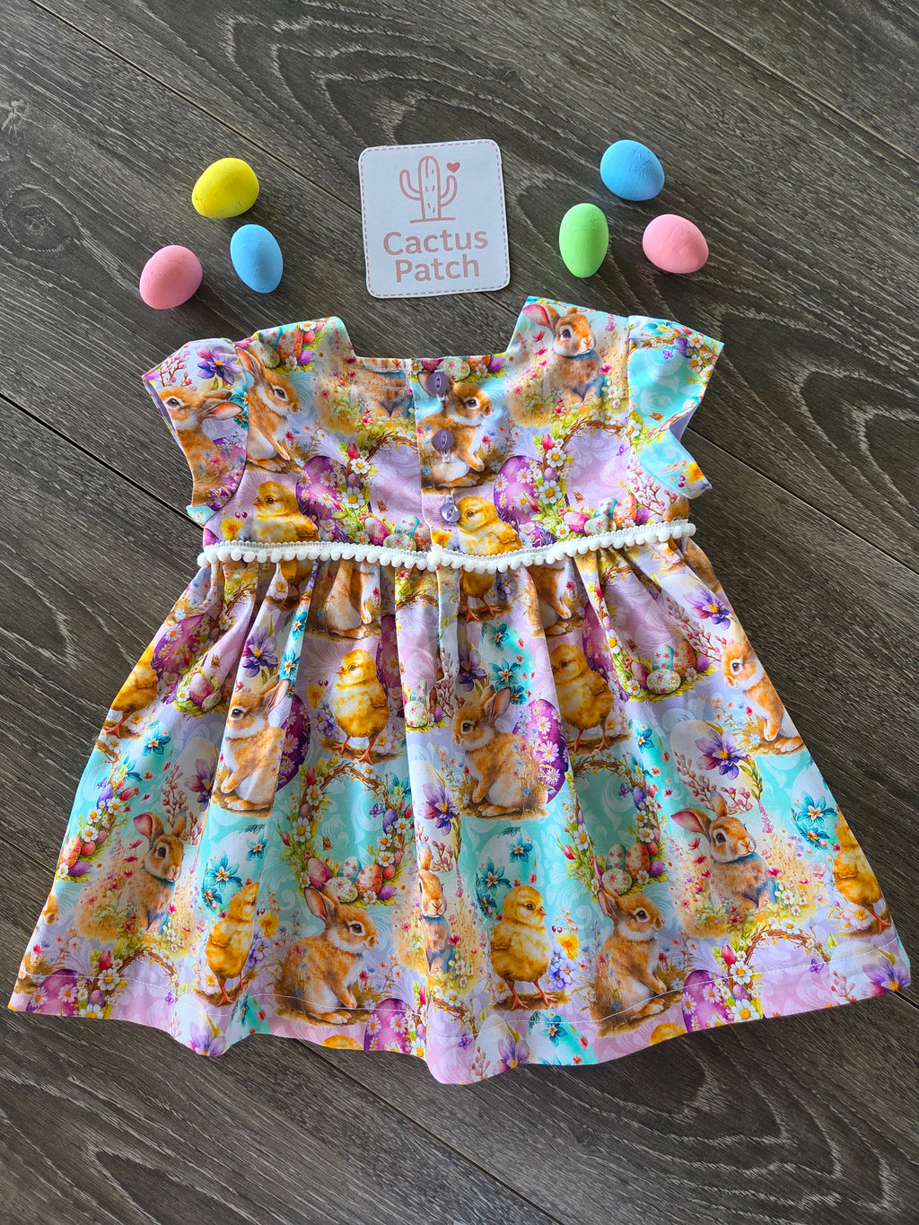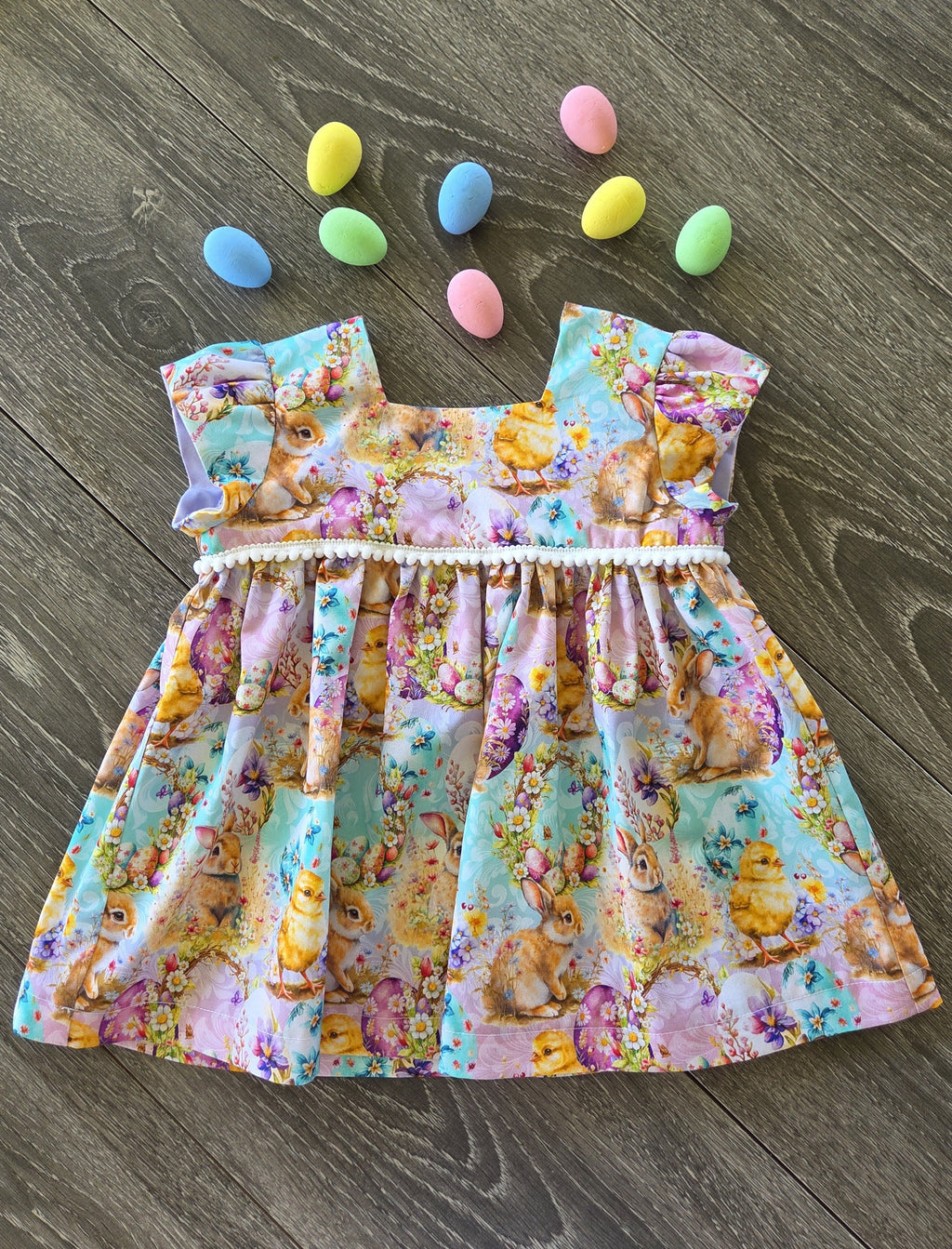 A pretty little dress handcrafted with some Easter magic. The cotton fabric features a colourful print filled with bunnies, chicks, florals, and soft pastels — perfect for egg hunts!