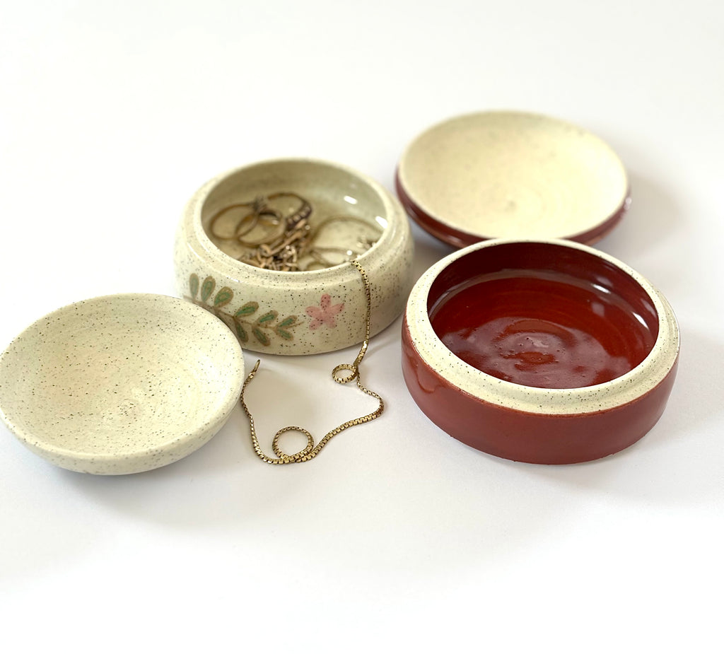 Handcrafted on the pottery wheel these unique, one of a kind jewellery boxes make a perfect gift for any occasion. No two are ever the same. They are perfect for your dresser or bathroom to hold your rings, earrings or bracelets. And is great to keep you from losing your favourite jewellery.
