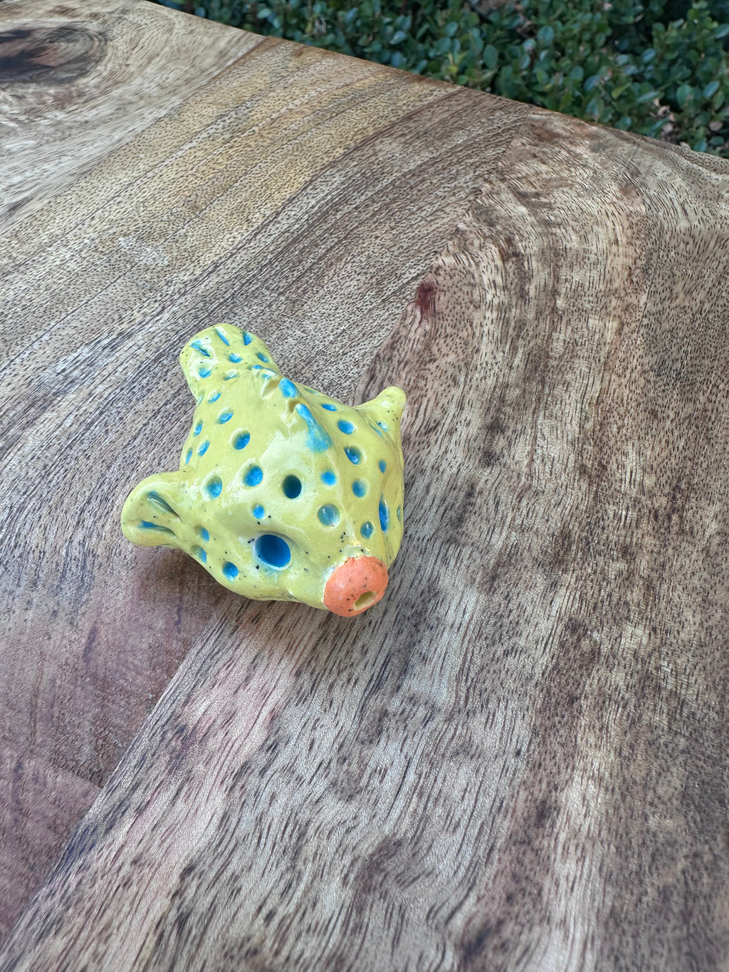 Handbuilt in bright reef yellow with blue spots and a soft orange mouth. Slightly wonky. Full of character.