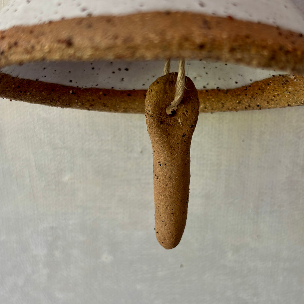 This bell is handmade from rustic Australian clay and glazed with a lovely snow white food safe glaze on the outside and left unglazed on the inside. It has a beautiful chime and hangs on a natural jute string.