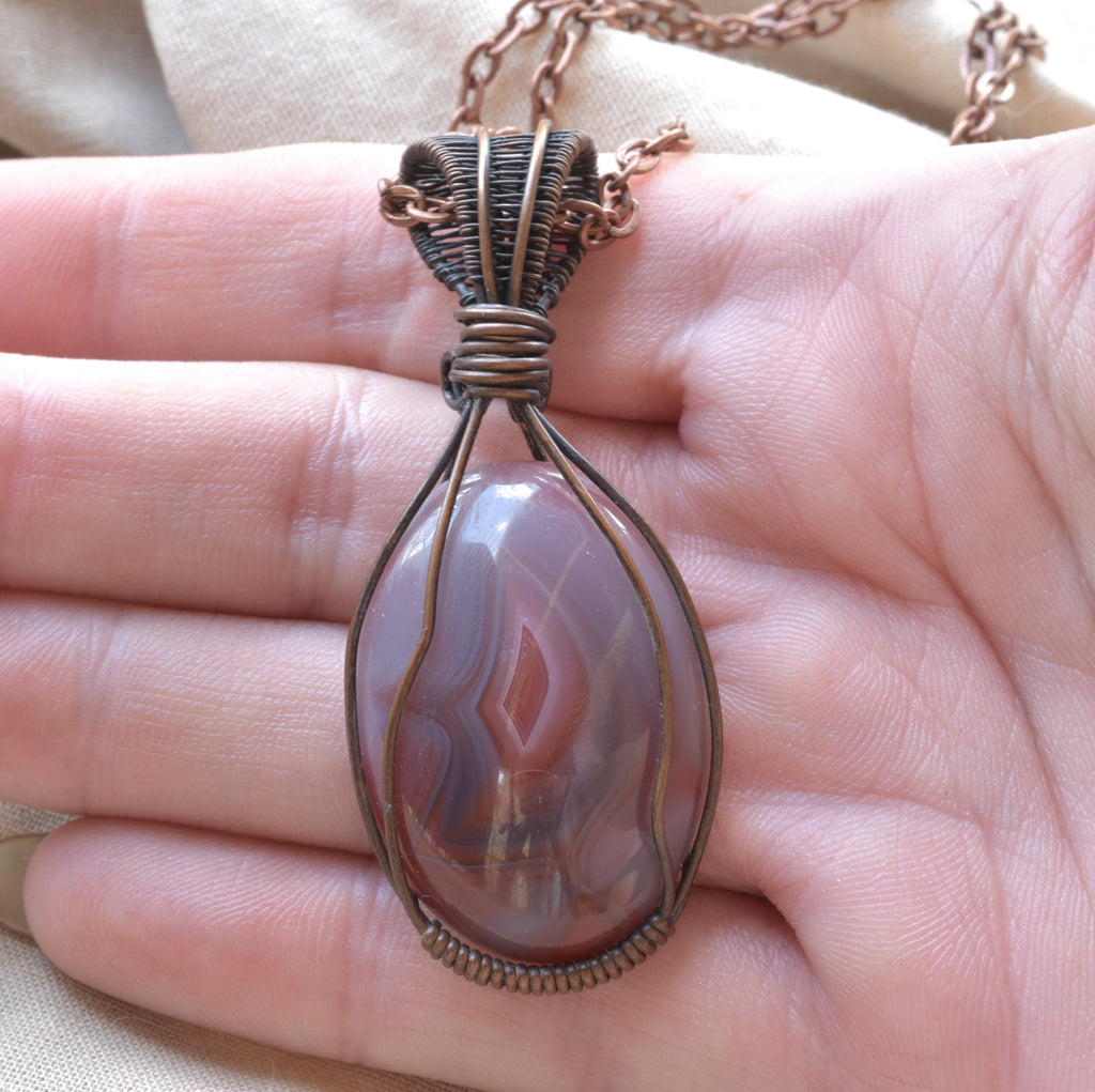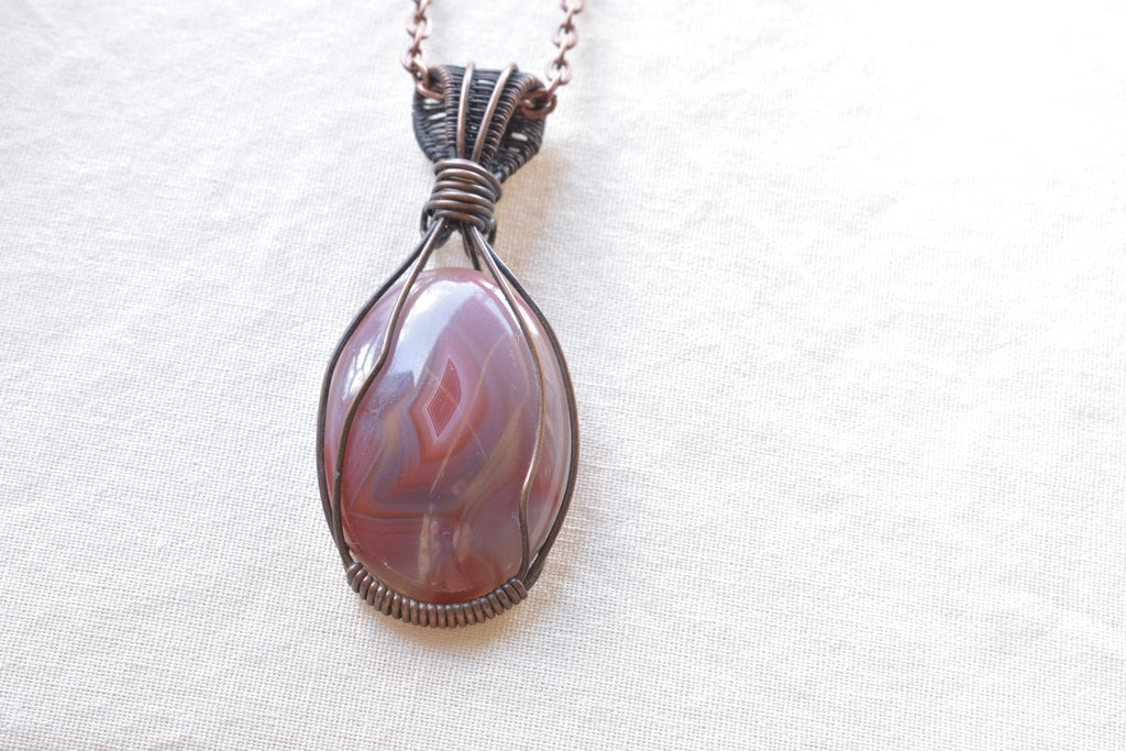The stone is hand-wrapped in copper wire, shaped to cradle its natural oval form while allowing the agate’s internal patterning to remain the focal point. The wrap is balanced and open, designed to support the stone without overwhelming its organic beauty.