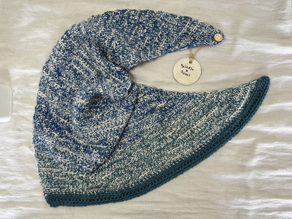 This striking scarf has been created with love and a combination of natural cream Australian Alpaca yarn from 'The Fibre of the Gods' right here in WA, and my own handspun yarn. The blue and turquoise yarns are a mixture of Merino & English Leicester Wools, along with unbleached Tussah Silk, and were spun by hand on my mini-Turkish spindle, and then crocheted with the cream alpaca yarn to produce a simple yet stunning scarf which will compliment many outfits, both casual and a bit more dressy.