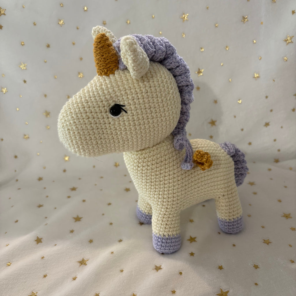 Luna the little unicorn knows her wings are too small to fly, but she’d like to try! She knows that one day she’ll reach the stars. She is hand crocheted in quality Australian cotton and stuffed with soft polyfil. She is 23cm tall and can stand all day on her strong little legs. Luna is ready to go to her forever home.
