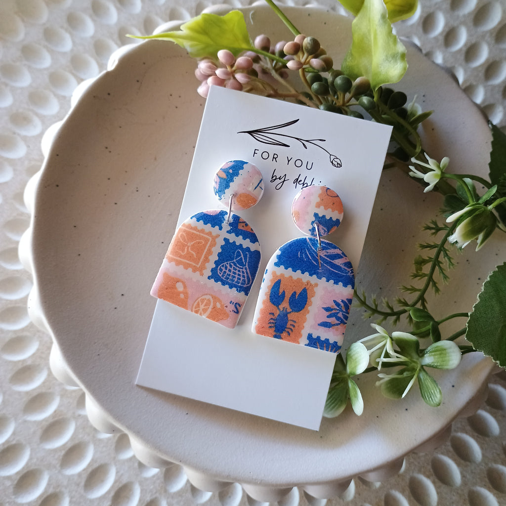 White sandpaper texture polymer clay top with embedded posts, a fun Italian theme holiday stamp print and uv resin. Free matching studs.