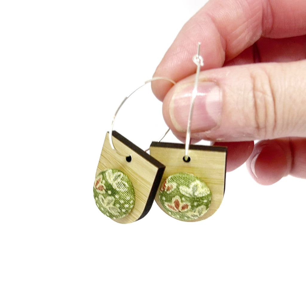 These bamboo ply and fabric drop earrings are handmade by me using beautiful Japanese Kimono and laser cut bamboo ply.