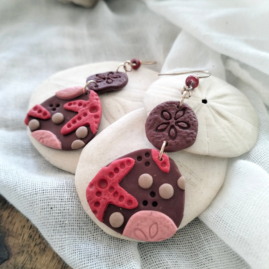 Sea stars and sand dollars decorate the polymer clay elements of these artful earrings. The unique, sea shore inspired design makes this beautiful pair of earrings perfect for everyday wear or special occasions. Lightweight and comfortable, they blend beachcombing charm with feminine pinks and neutrals, adding a touch of nature’s beauty to any outfit.