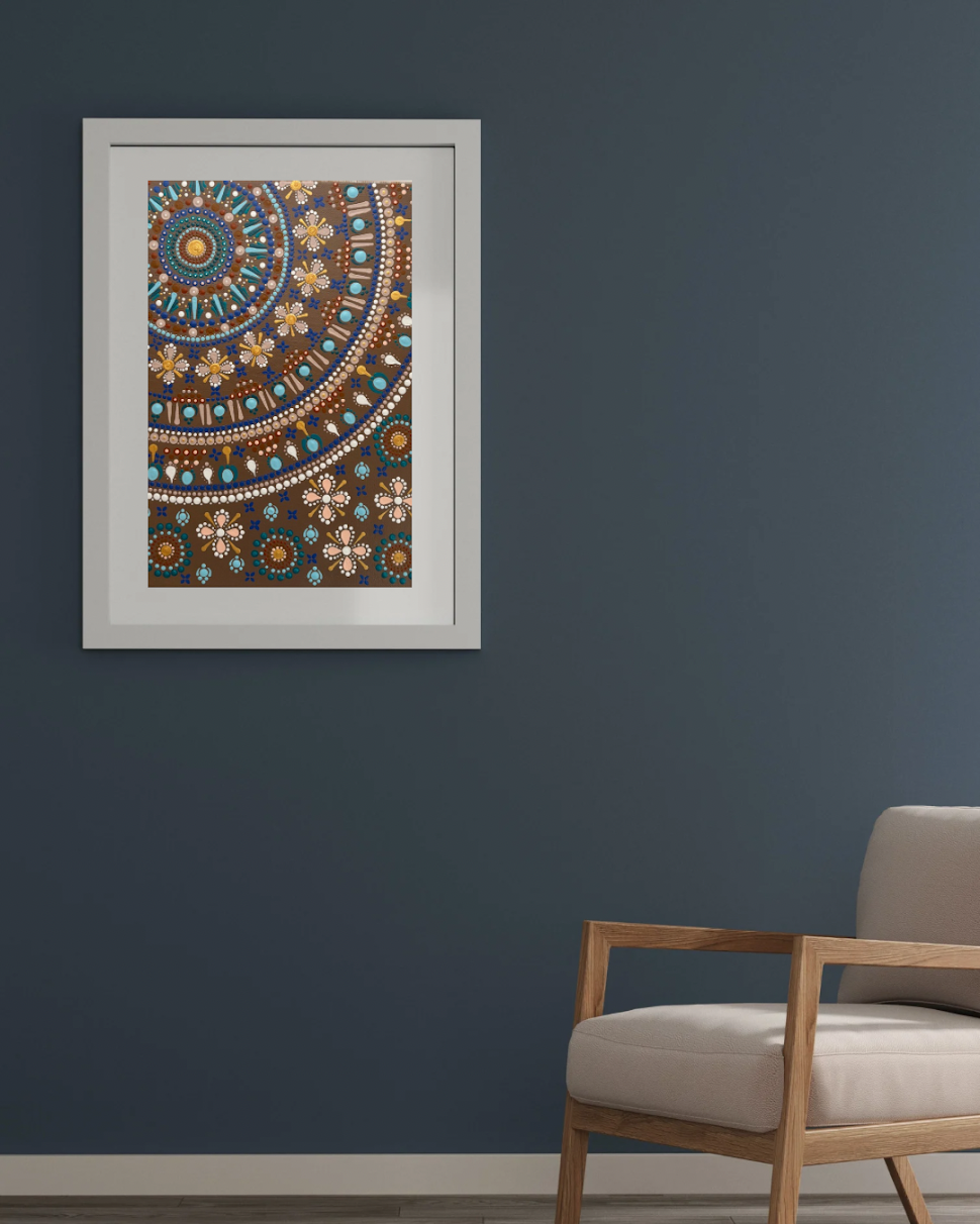 Earthbound is a slowly created and mindfully hand-dotted mandala painted in soft, gentle, earthy colours guaranteed to bring a sense of calm and grounding to any space. The neutral colour palette will suit any room and bring a sense of warmth to your space. Can you envisage Earthbound in your special space?