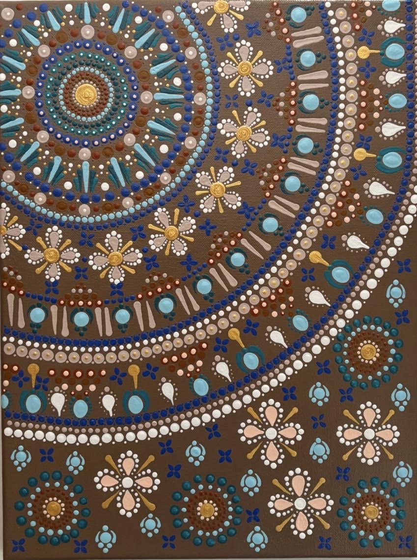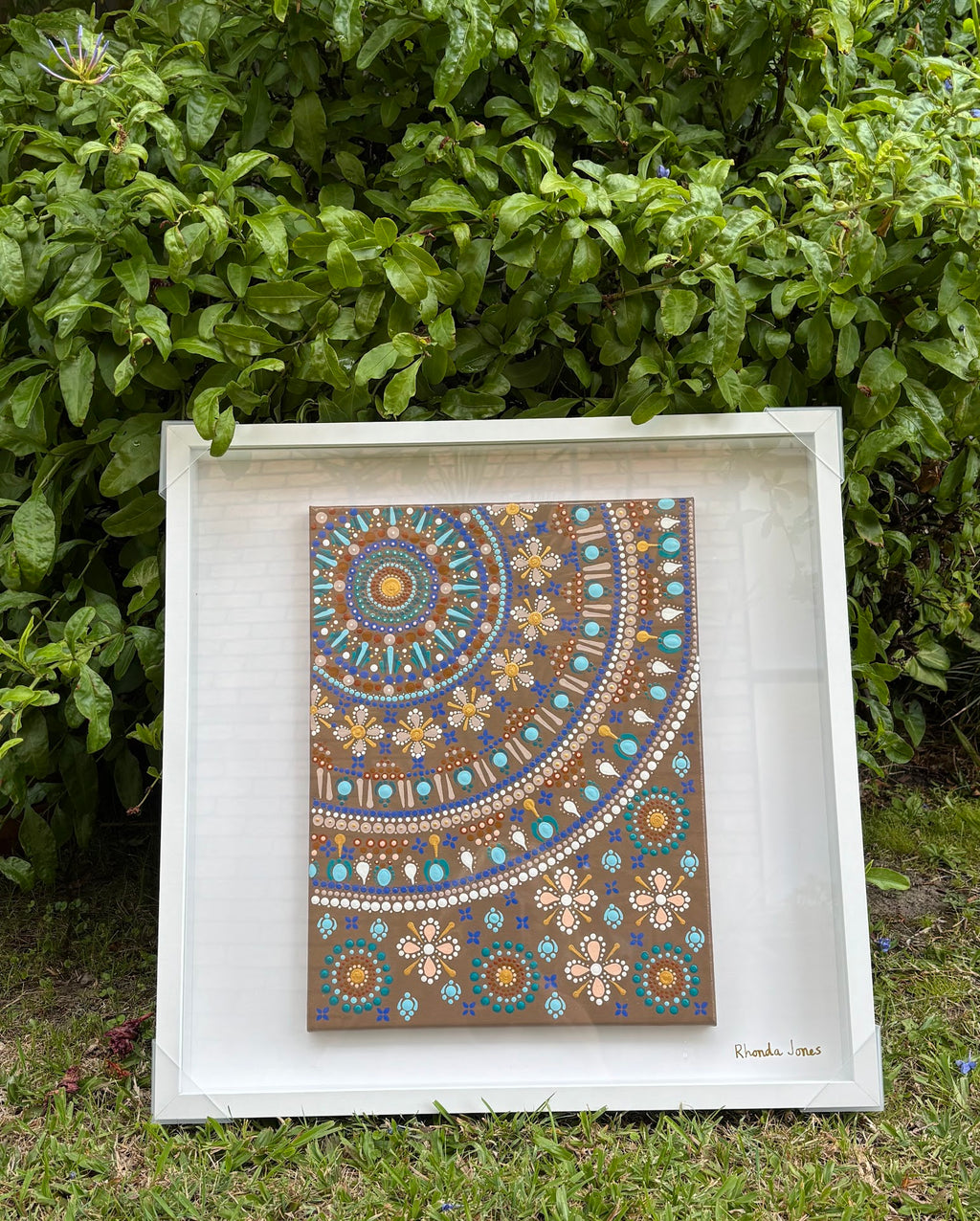 A mandala is an ancient circular design of repeated patterns and colours that radiate from the centre circle and were used for meditation and healing. Rhondalas Mandalas are a modern take on mandalas, painted for the purpose of developing creative expression to bring balance, harmony, mindfulness and a sense of calm into the mind. Every mandala I hand-dot is created with intention that reflects a moment or feeling in time.