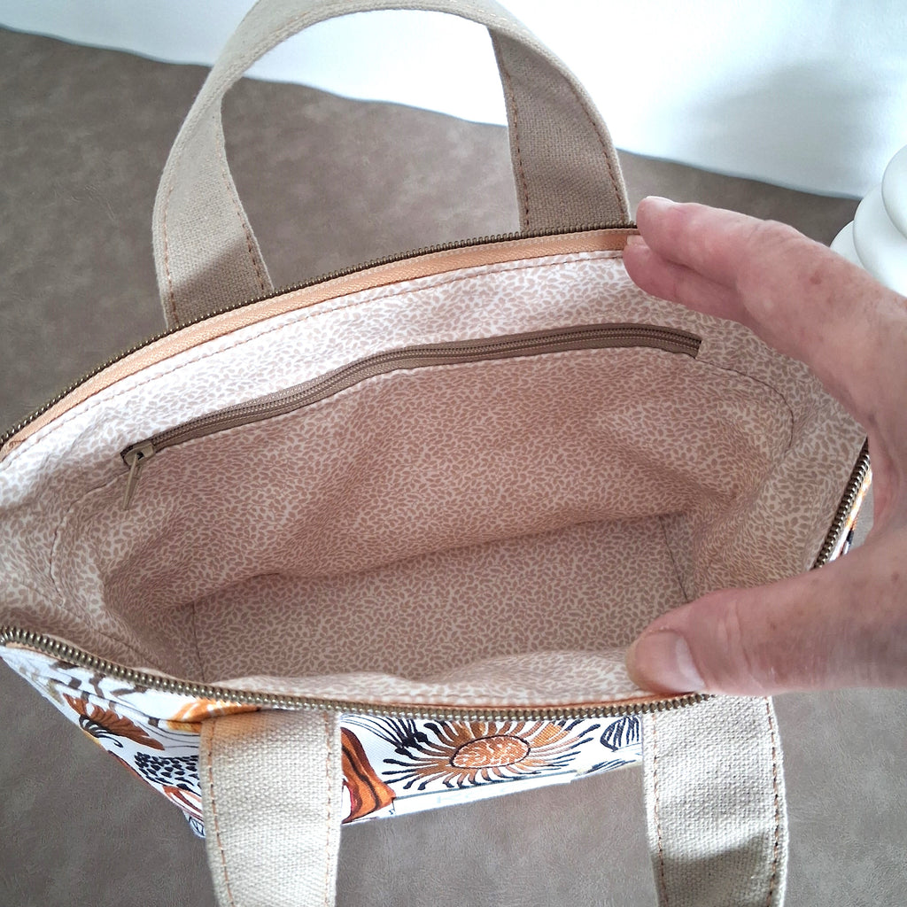 Made from cotton canvas on the outer and quilters cotton on the interior, the bag is well structured with firm stabilisers and will easily stand on it’s own. The 1½ “ wide straps give a good hand-hold on the bag.
