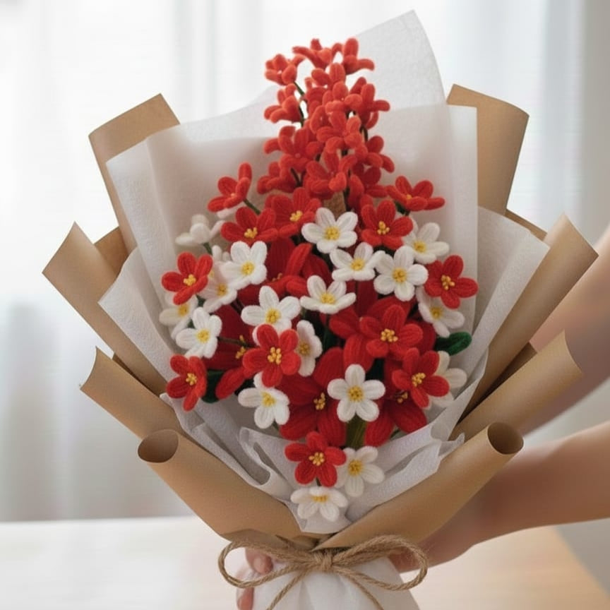 Give a gift that never wilts. This stunning, handmade bouquet features a vibrant mix of cherry-red and crisp-white blossoms, accented with delicate yellow centers.