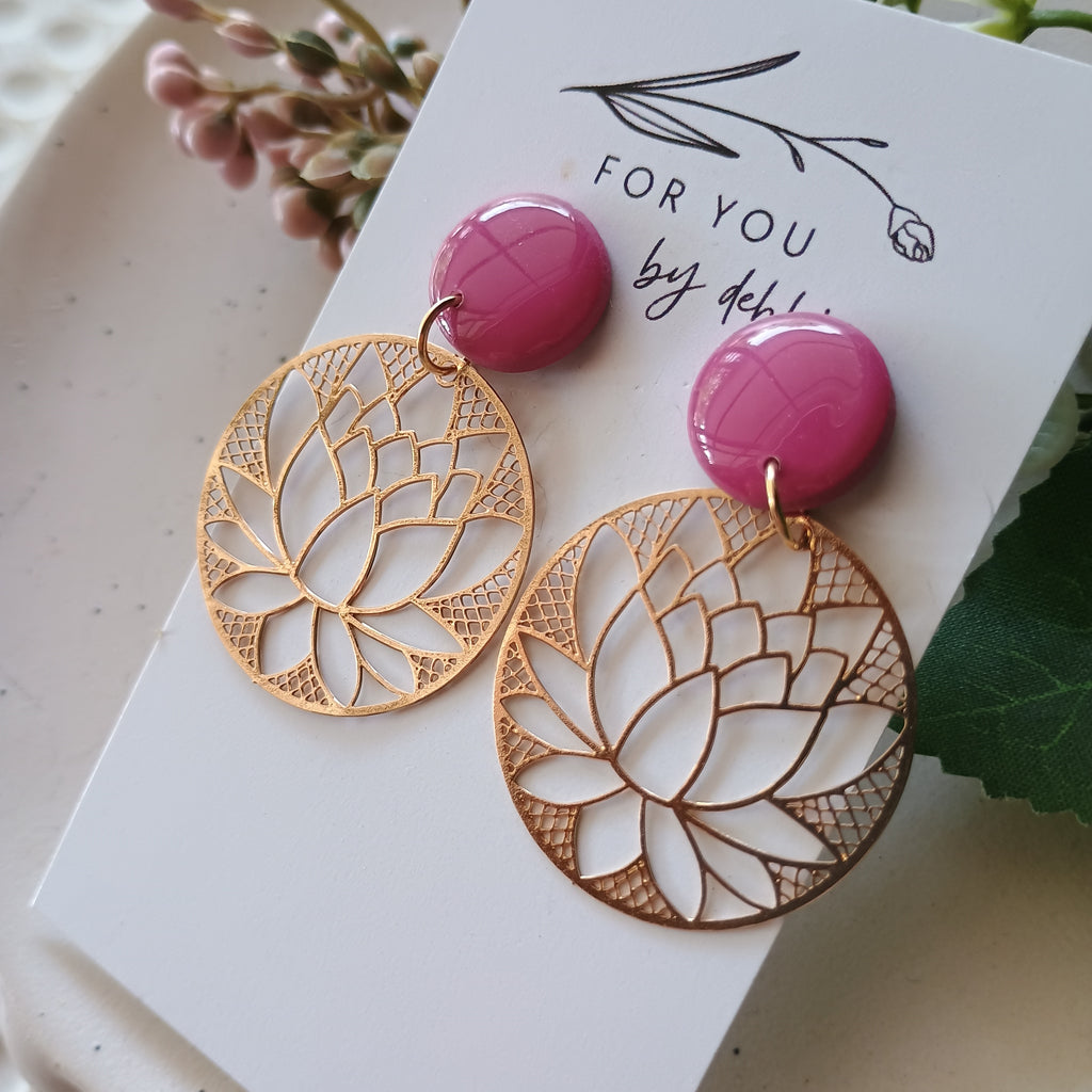 Rosy pink polymer clay with UV resin. Gold tone filigree metal charm