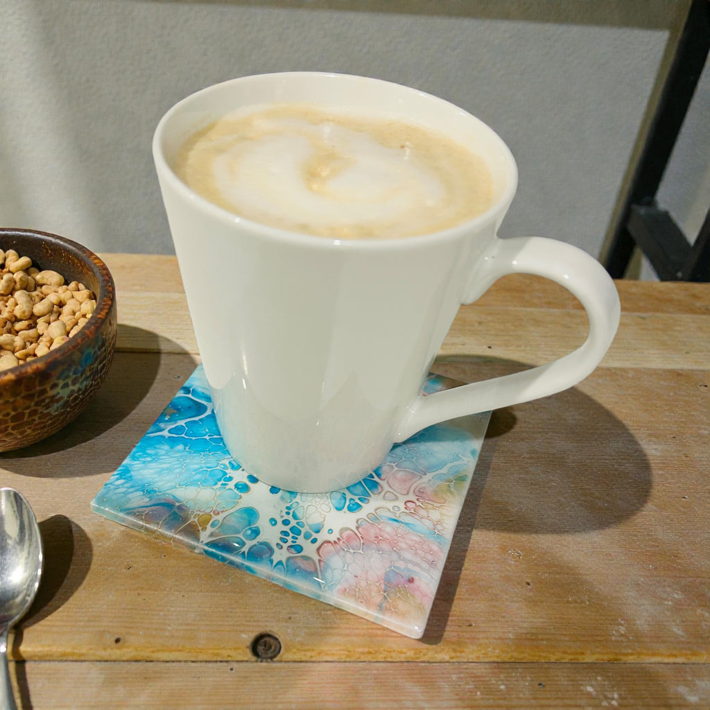 Both Acrylic paints and Mica pigments are used in this design and completed with resin and cork on the back.
