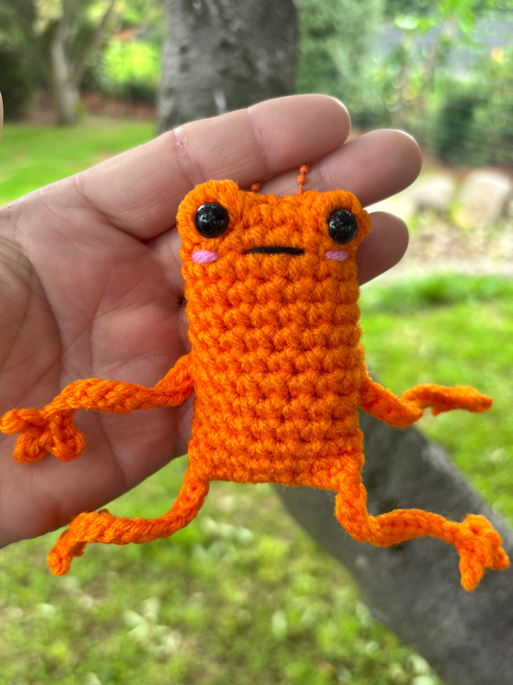 These little funny floppy crochet frogs are perfect in your pocket, keys or hanging on your bag! Made with soft acrylic yarn, safety eyes and filled with poly-fil.