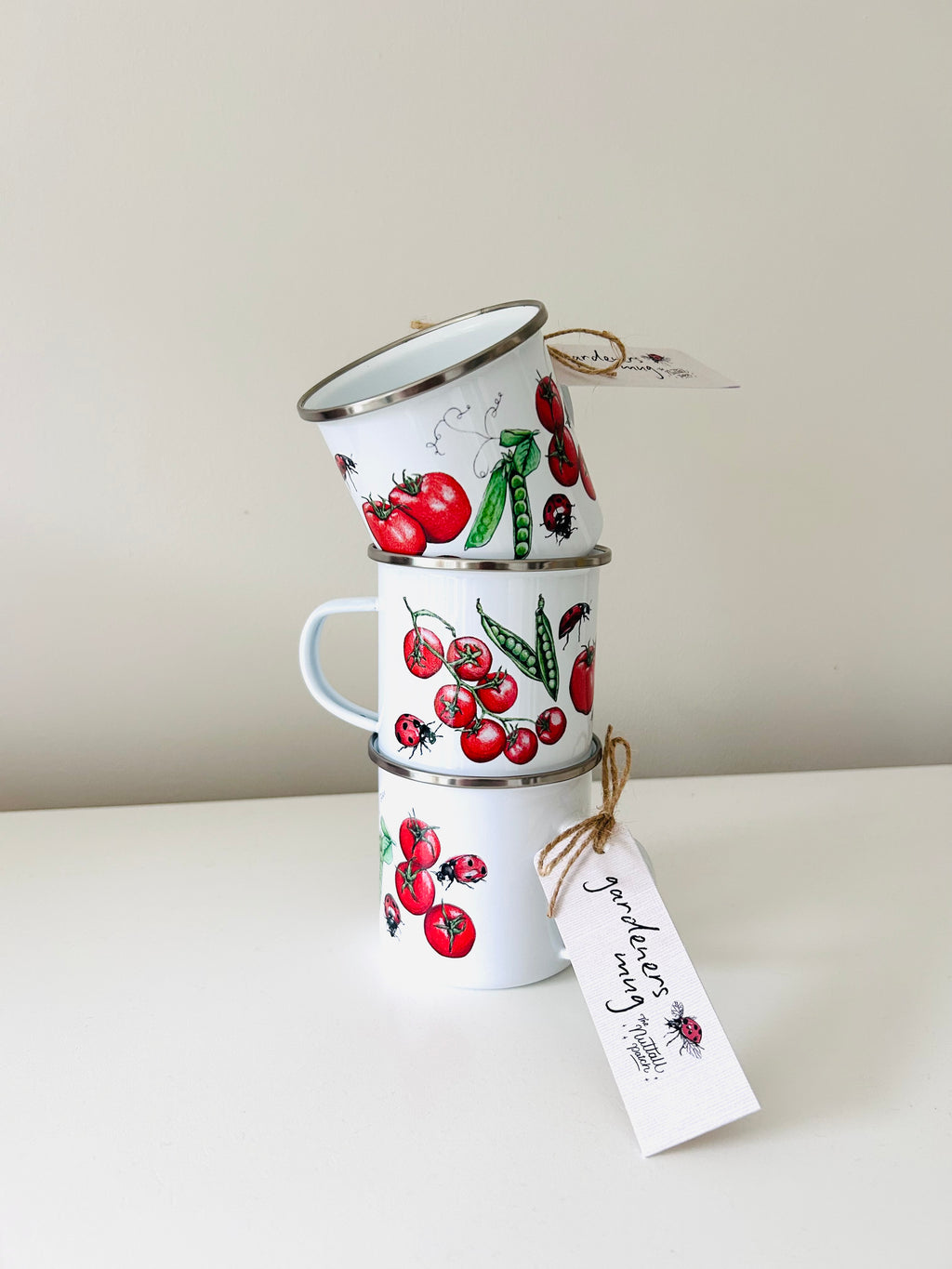 Durable enamel mug - hand wash only, not microwave safe; final photo shows other designs available - original artwork by Sophie Nuttall.