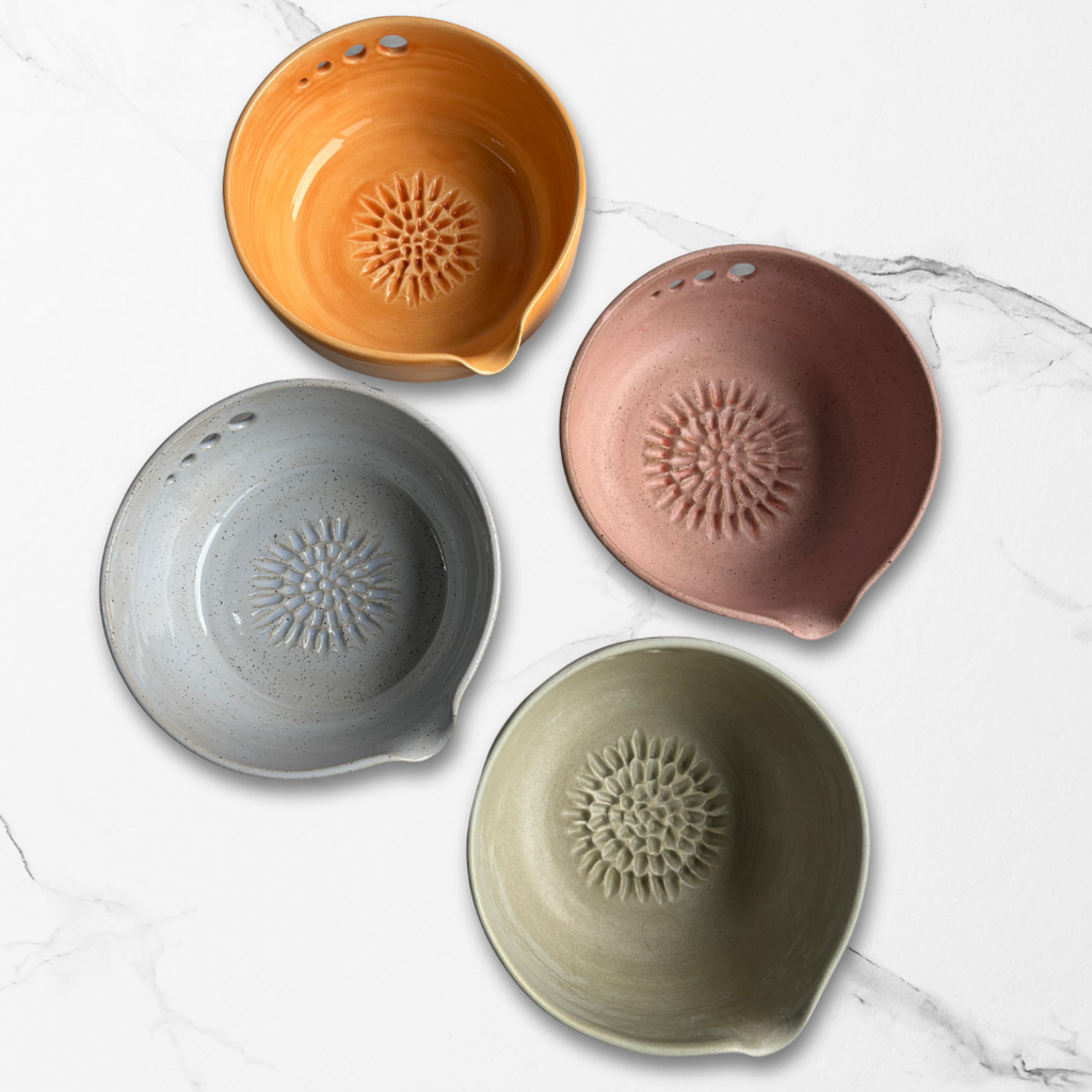 Crafted on the pottery wheel the Garlic Grater Dressing Bowl is the sibling to our famous Garlic/Ginger Grater Herb Stripper. We decided to make a bowl version so you can make your salad dressings and marinades all in the one bowl. It will grate garlic, ginger, puree strawberries and tomatoes plus it will also strip herbs from their stem. Made from premium Australian stoneware clay and are dishwasher safe, making cleaning a breeze.
