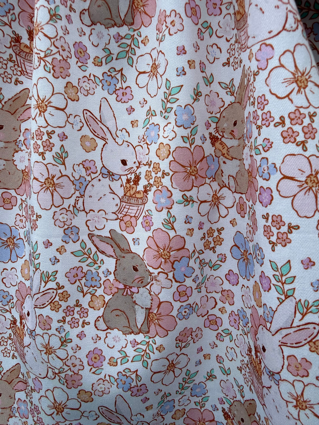 Handmade in super pretty pink cotton fabric with sweet bunnies and flowers all over.