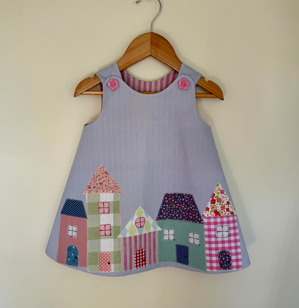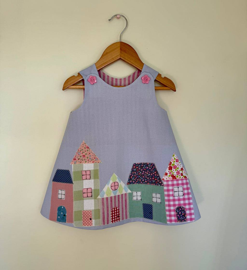 Made in pale mauve cotton and appliquéd with cute little houses along the hemline. A complete one of a kind.