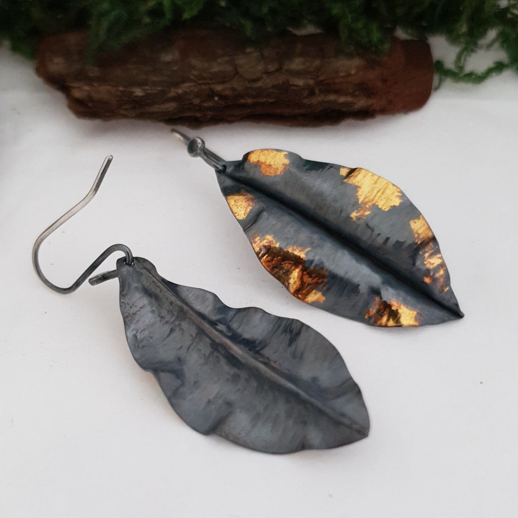 Once the shapes were finished, I applied 24 karat gold using a technique called keum-boo where gold is fused to silver. Finally, I applied a dark patina which adheres to silver but does not affect the gold. The result is an original pair of earrings with an elegant shape, timeless elegance and subtle shine of the gold against the dark silver.