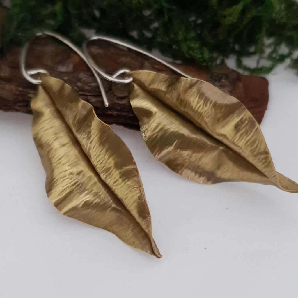 Made completely from scratch from a sheet of brass and sterling silver wire, by folding, hammering, texturing and shaping the metal. The leaves have been gently polished to reveal highlights against darker patina for a more natural look, and then sealed with a specially formulated lacquer for metals to protect the finish. They come ready to wear on handmade sterling silver wires.