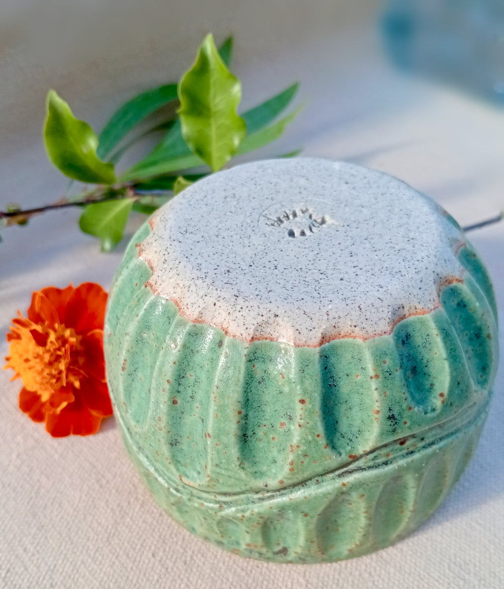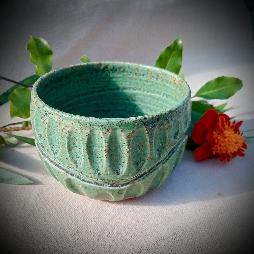 The gumleaf green mat glaze looks spectacular with the rusty amber speckles and the areas where the glaze pools to charcoal. And it has a delicious spiral in the bottom.