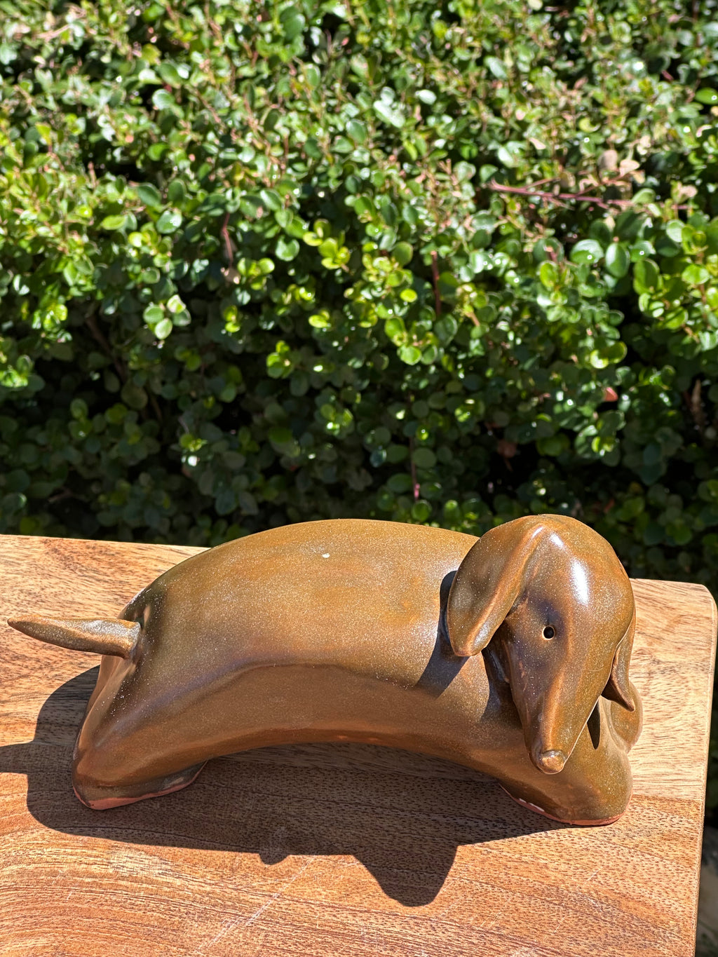 Handbuilt in Walkers clay and finished in a rich gumnut glaze, this ceramic sausage dog shifts between warm brown and soft bronze tones as the light moves across him. The glaze is carried throughout, creating a smooth, tactile surface with natural ebb and flow, pooling and breaking in ways only the kiln can decide.