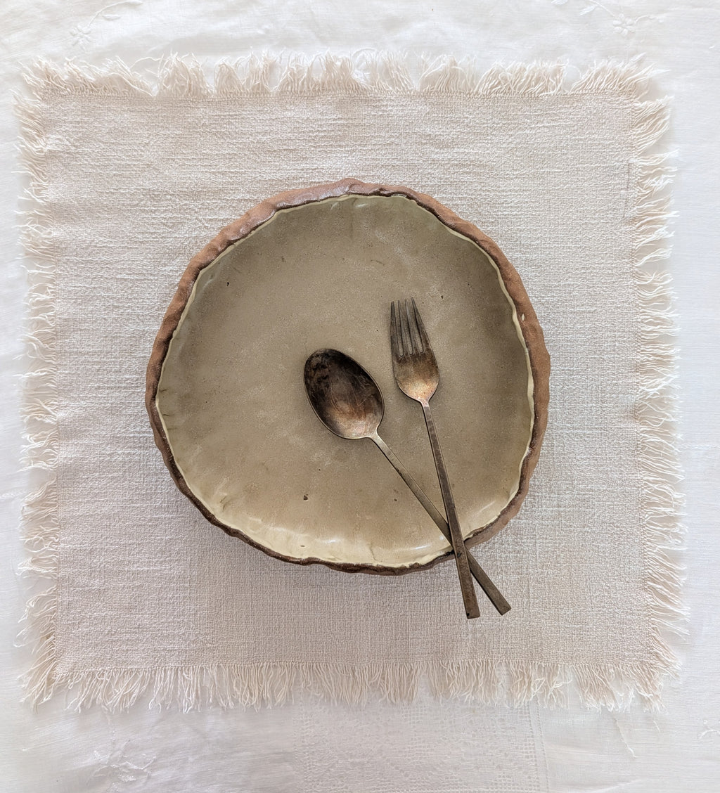 Our chosen clay and glaze combination reflects our times spent quietly observing our beach and coastline. Cool sand tones, lightly textured yet soft to the touch.