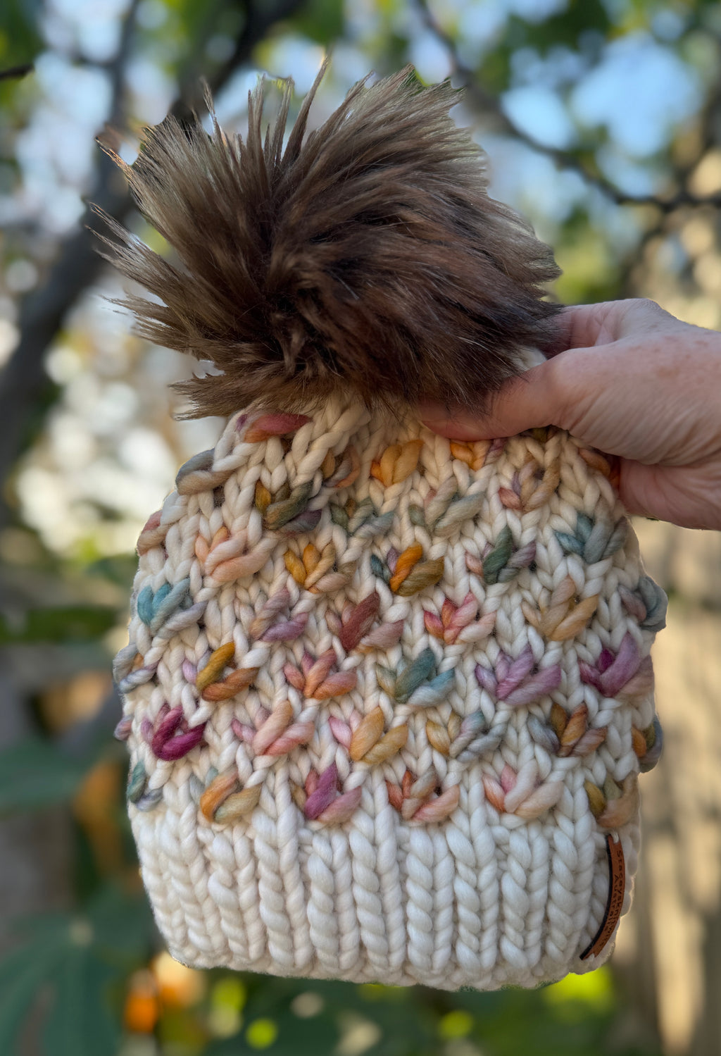 The natural cream color wool beanie has a contrasting stunning greens oranges and more pastel color lotus flower design and finished off perfectly with a bronze faux fur PomPom.