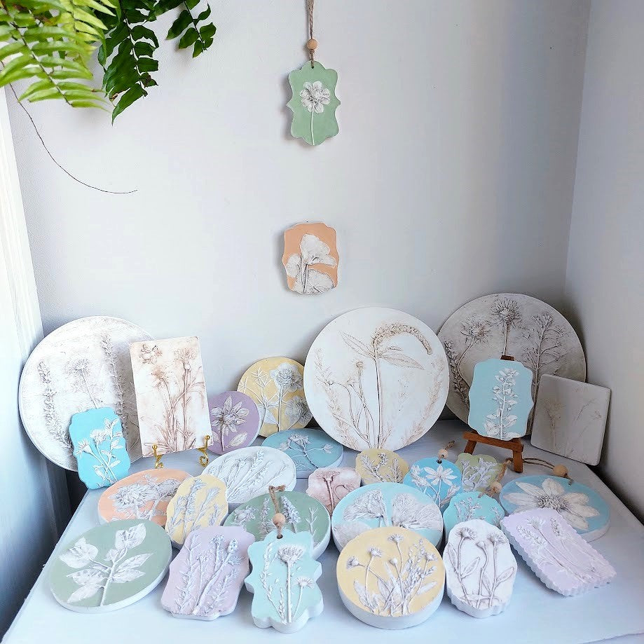 Using an age-old press-moulding process, I press each flower into clay, then cast the impression in a strong plaster compound to capture every fine detail, petals, veins, and texture, forever.