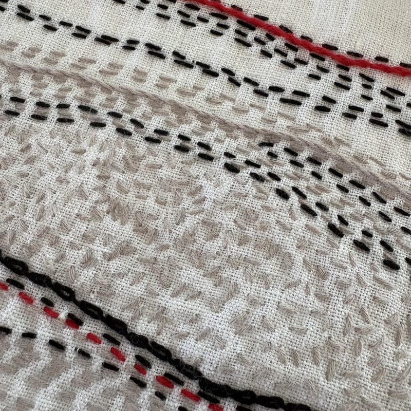 Hand embroidered in style that is inspired by Japanese sashiko, this is a freestyle design, ie no pattern used, and stitched in black and taupe with a touch of red.
