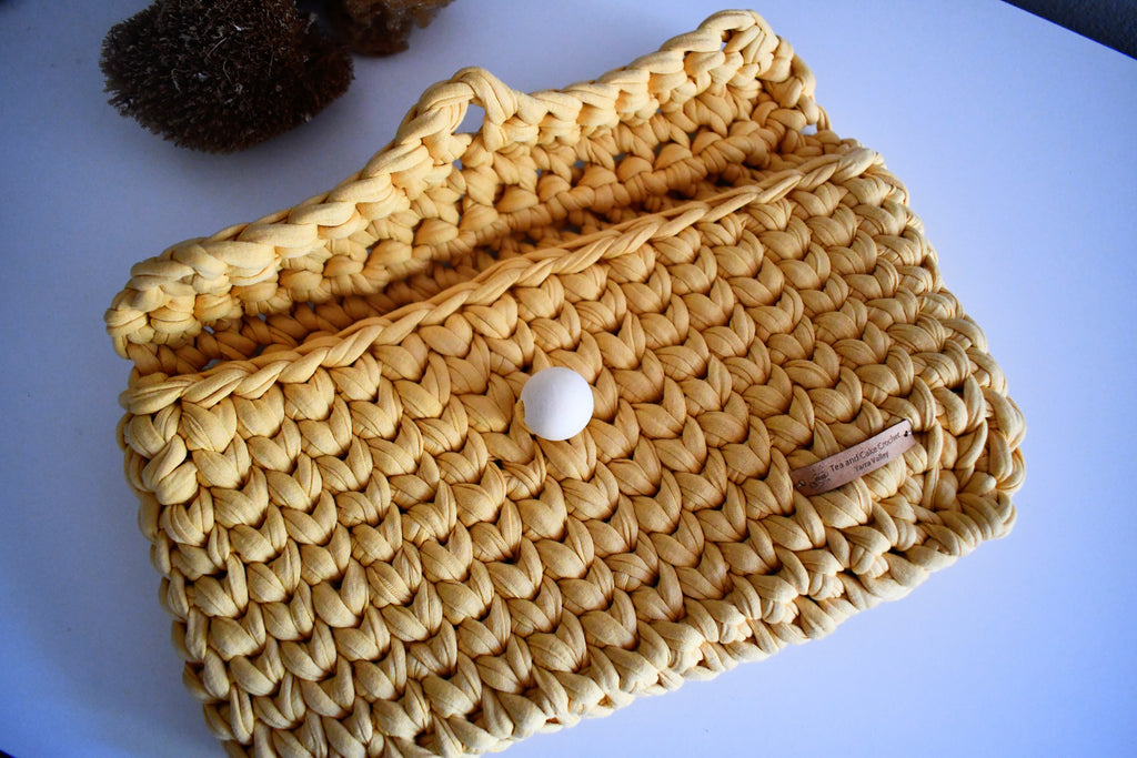 This mustard coloured crocheted clutch is a gorgeous addition to any wardrobe