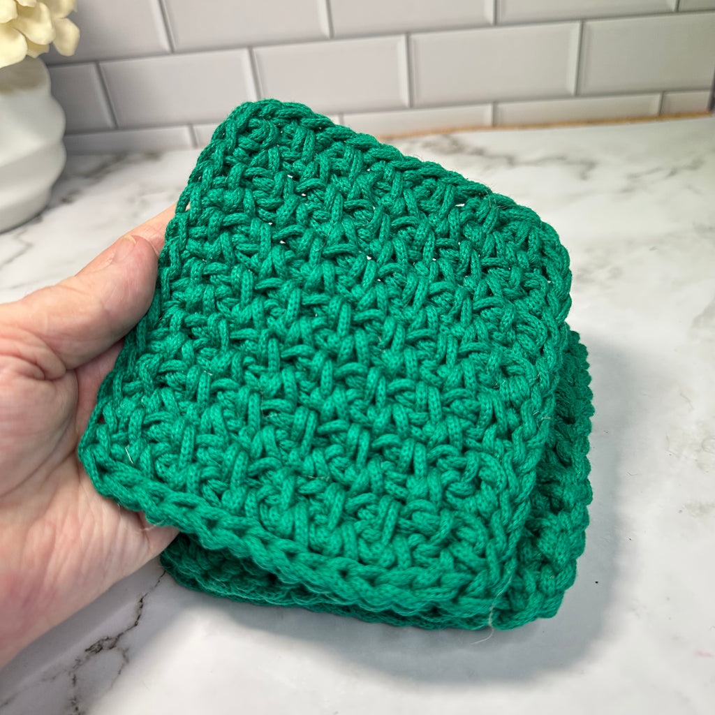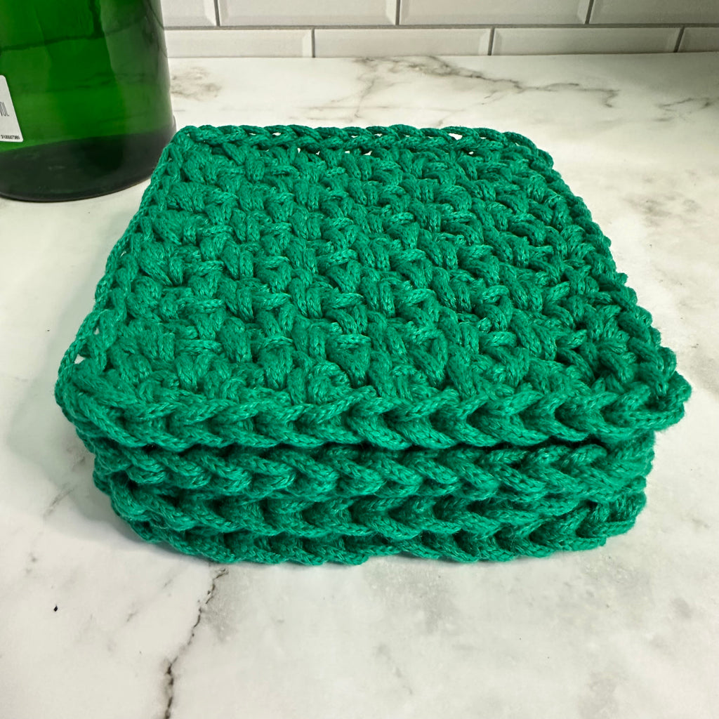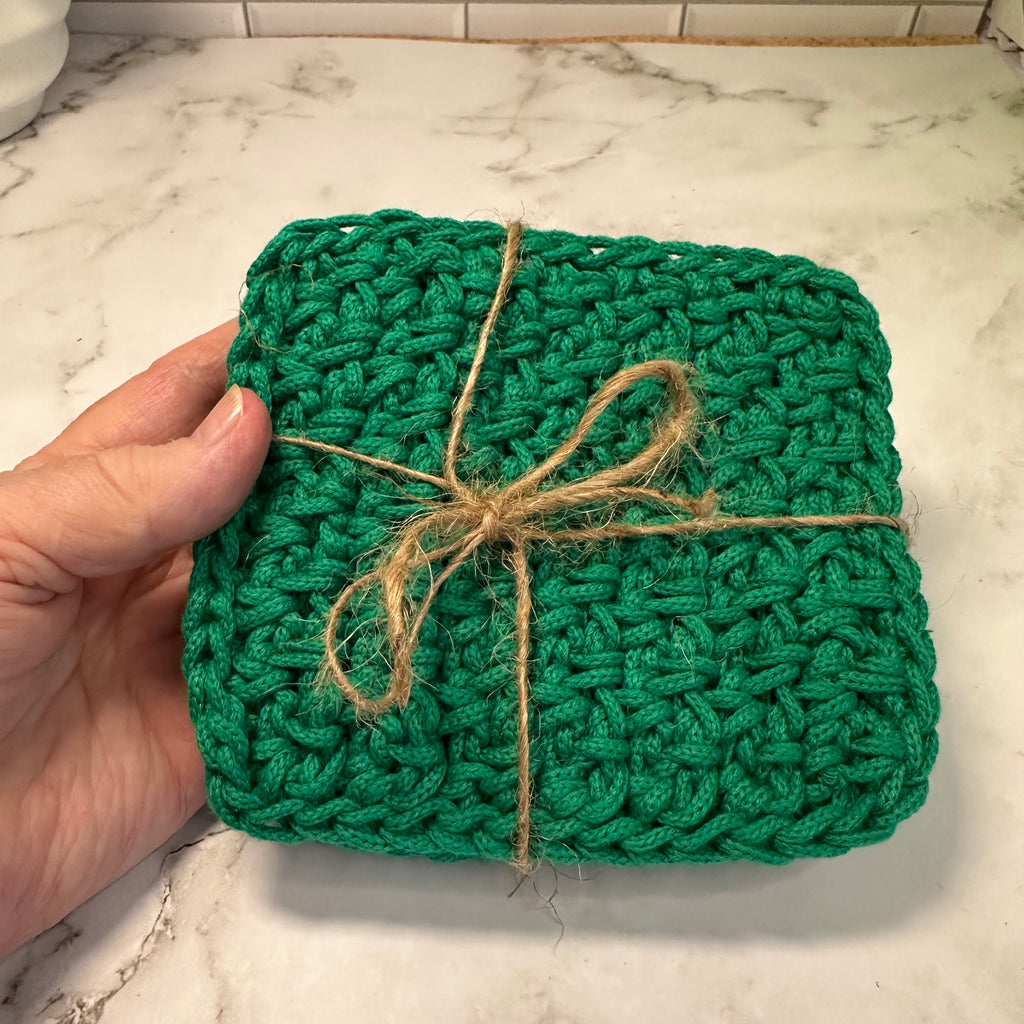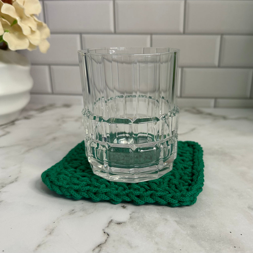 This set of 4 emerald green crocheted coasters are handmade using braided yarn, giving them a lovely chunky texture that feels as good as it looks. The deep green tone adds a natural feel to any space, making them a lovely addition to coffee tables, your desk, or in dining & living areas.
