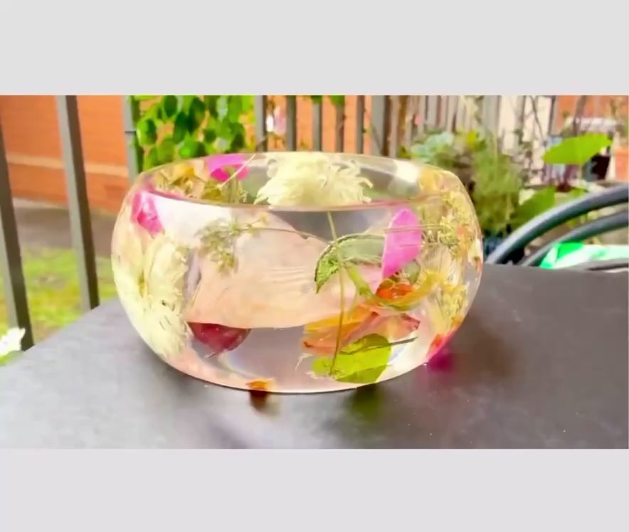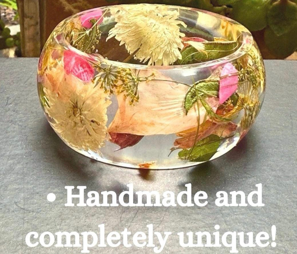- Handmade, one-of-a-kind pressed flower resin bangle