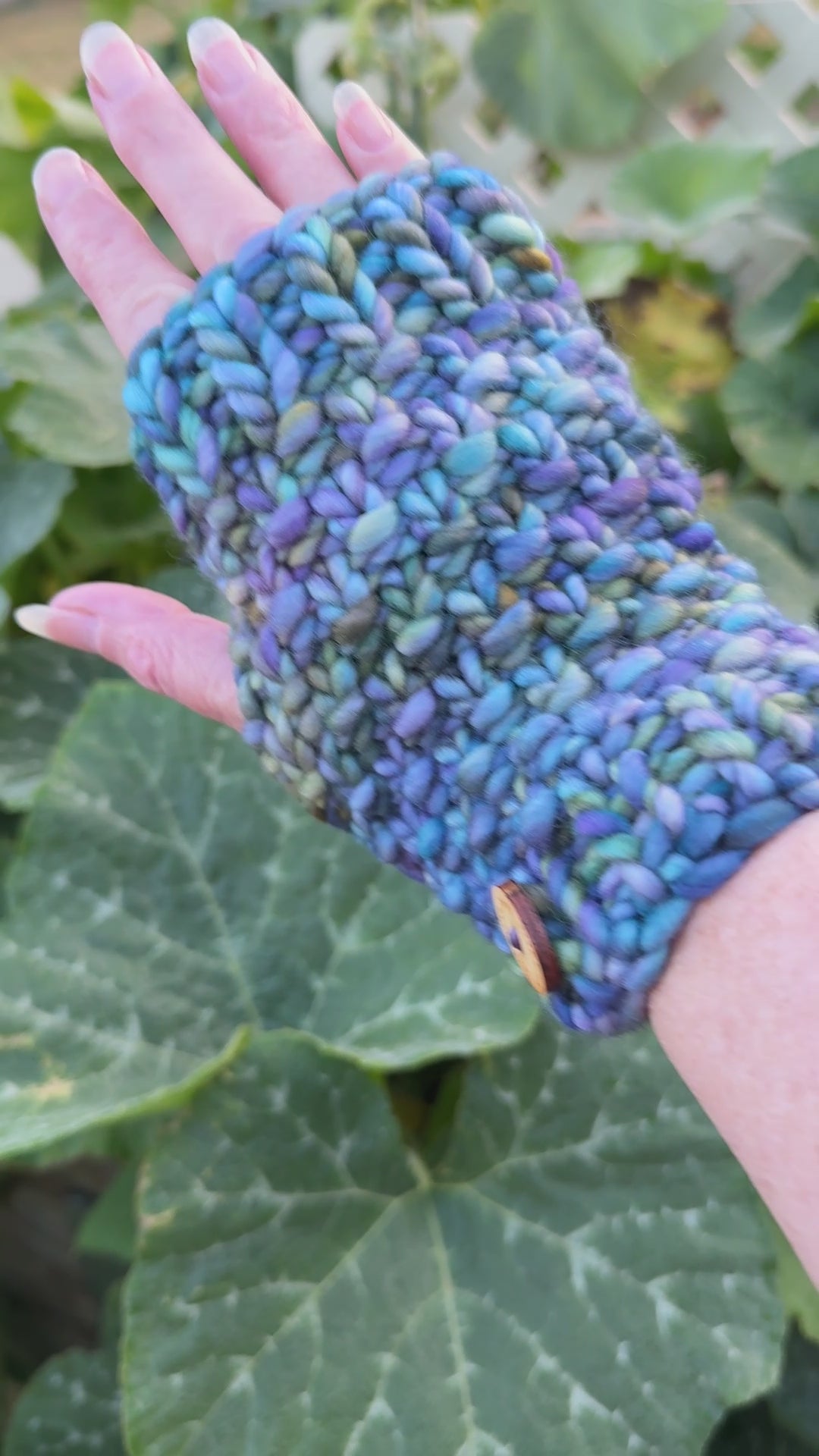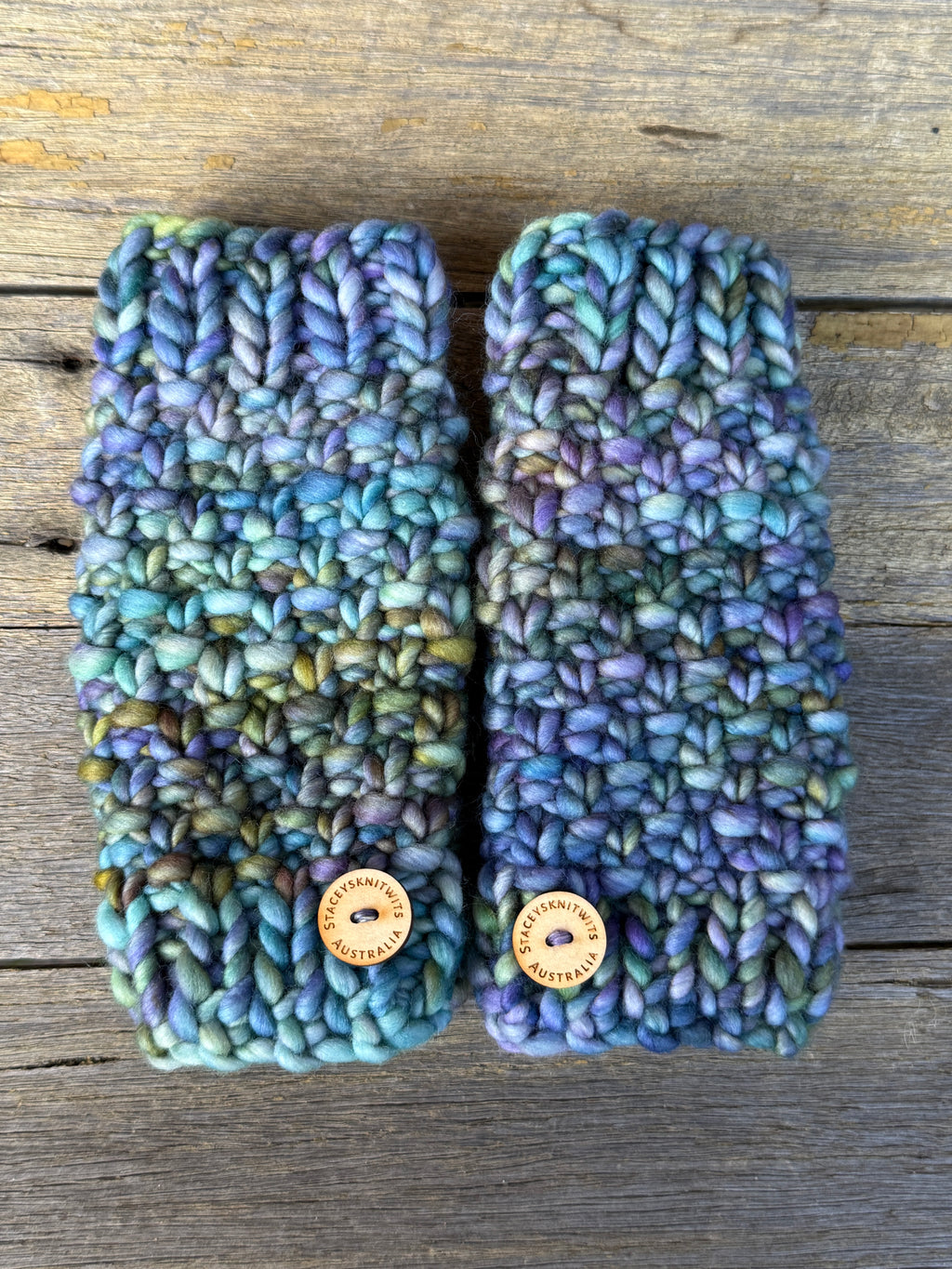 Using a lovely Malabrigo Rasta merino wool a high quality finish is achieved. Wooden buttons are sewn to each glove showing the love and attention to detail. The buttons say “Staceysknitwits Australia”.